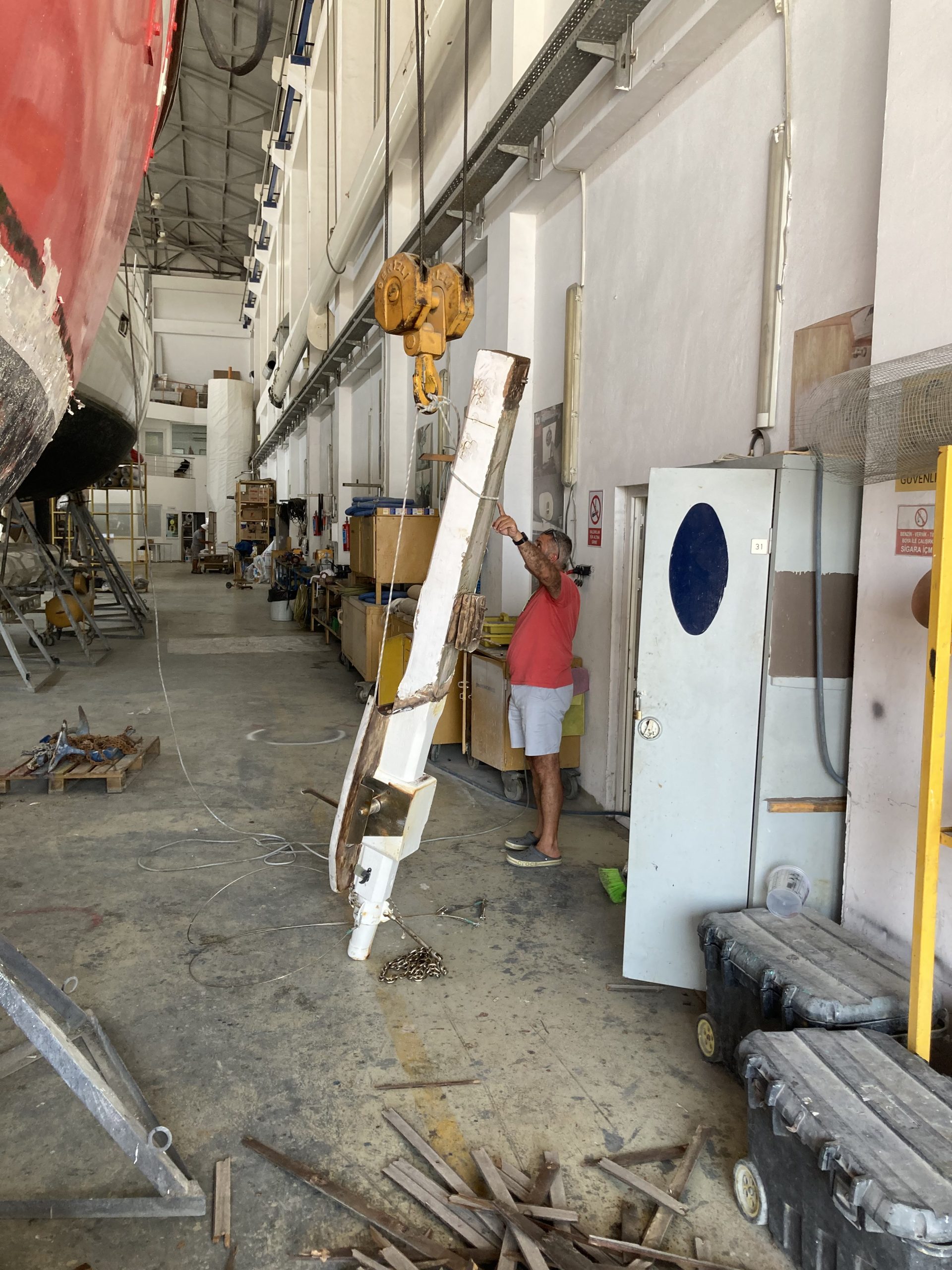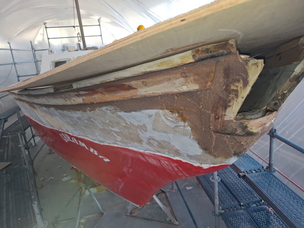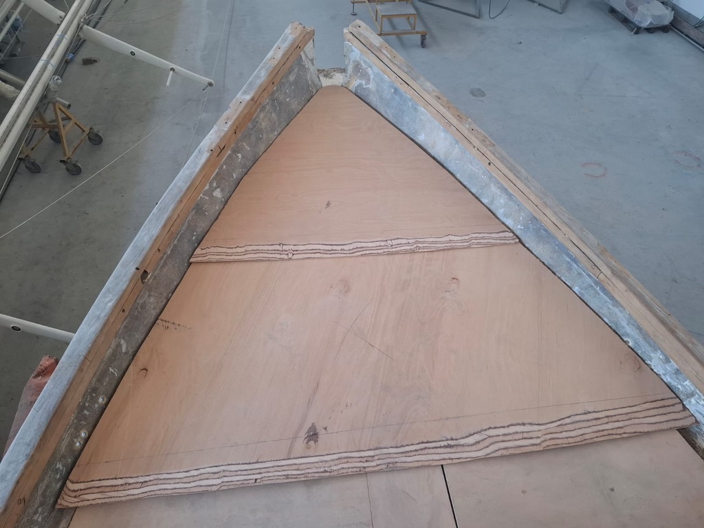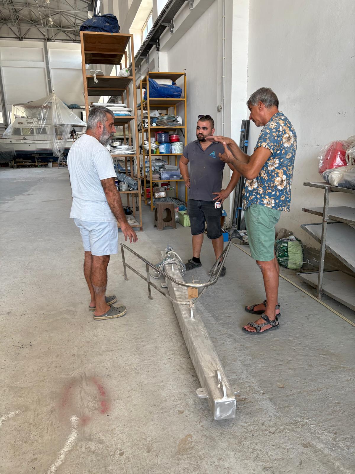 Bowsprit Fifty years old wooden bowsprit is removedTaken down with the craneThe bow will be reinforced with plywood and fiberglassTwo bulwarks are preparedAnd fixed with layers of fiberglass cloth & polyester resinThe deck at the bow is reconstructed & reinforcedMeanwhile the new bowsprit is planned3D plans are prepared with every detailplans are forwarded to Murat Usta in Istanbul, for being constructed from 10 mm aluminiumthe bowsprit is carried to Didim along with the water & diesel tanksBowsprit and windlass are lifted to the deckAnd tried repeatedlyPositioning of the pulpit is discussed