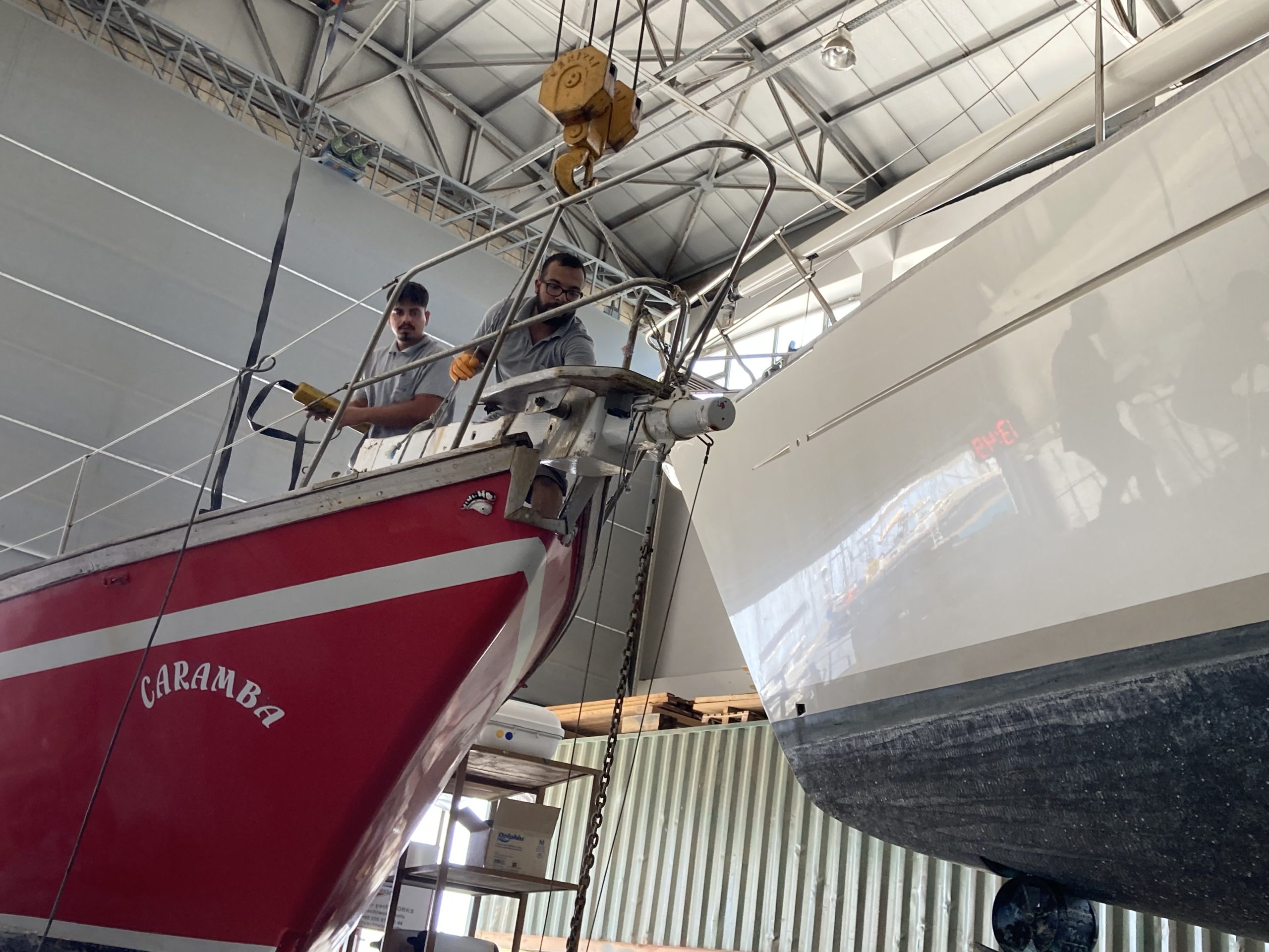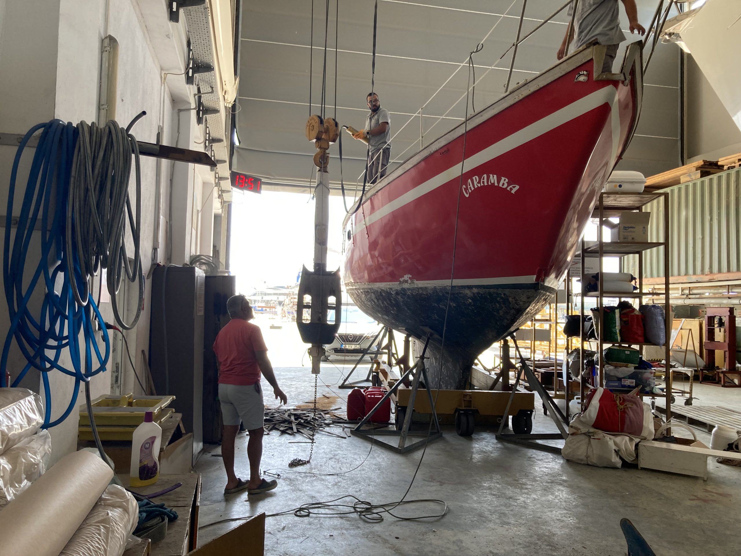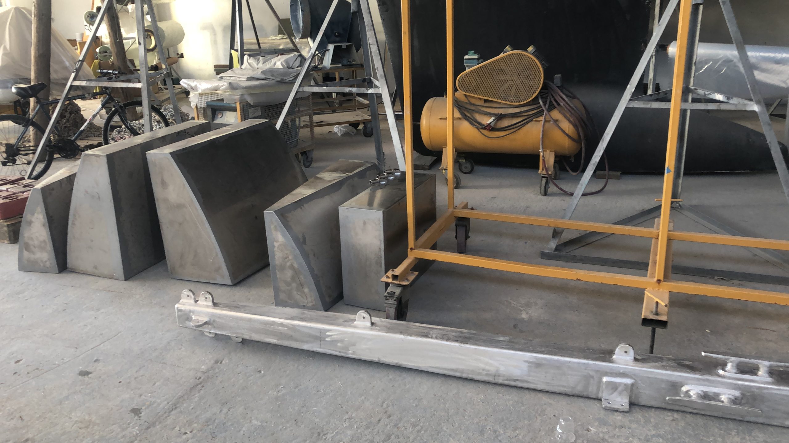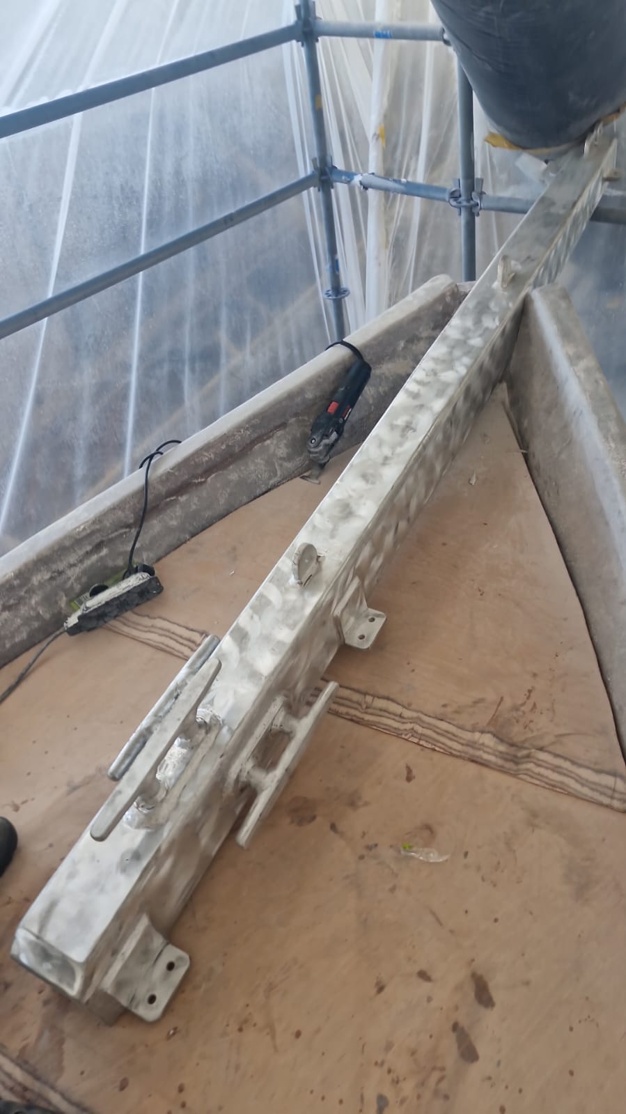 Bowsprit Fifty years old wooden bowsprit is removedTaken down with the craneThe bow will be reinforced with plywood and fiberglassTwo bulwarks are preparedAnd fixed with layers of fiberglass cloth & polyester resinThe deck at the bow is reconstructed & reinforcedMeanwhile the new bowsprit is planned3D plans are prepared with every detailplans are forwarded to Murat Usta in Istanbul, for being constructed from 10 mm aluminiumthe bowsprit is carried to Didim along with the water & diesel tanksBowsprit and windlass are lifted to the deckAnd tried repeatedlyPositioning of the pulpit is discussed