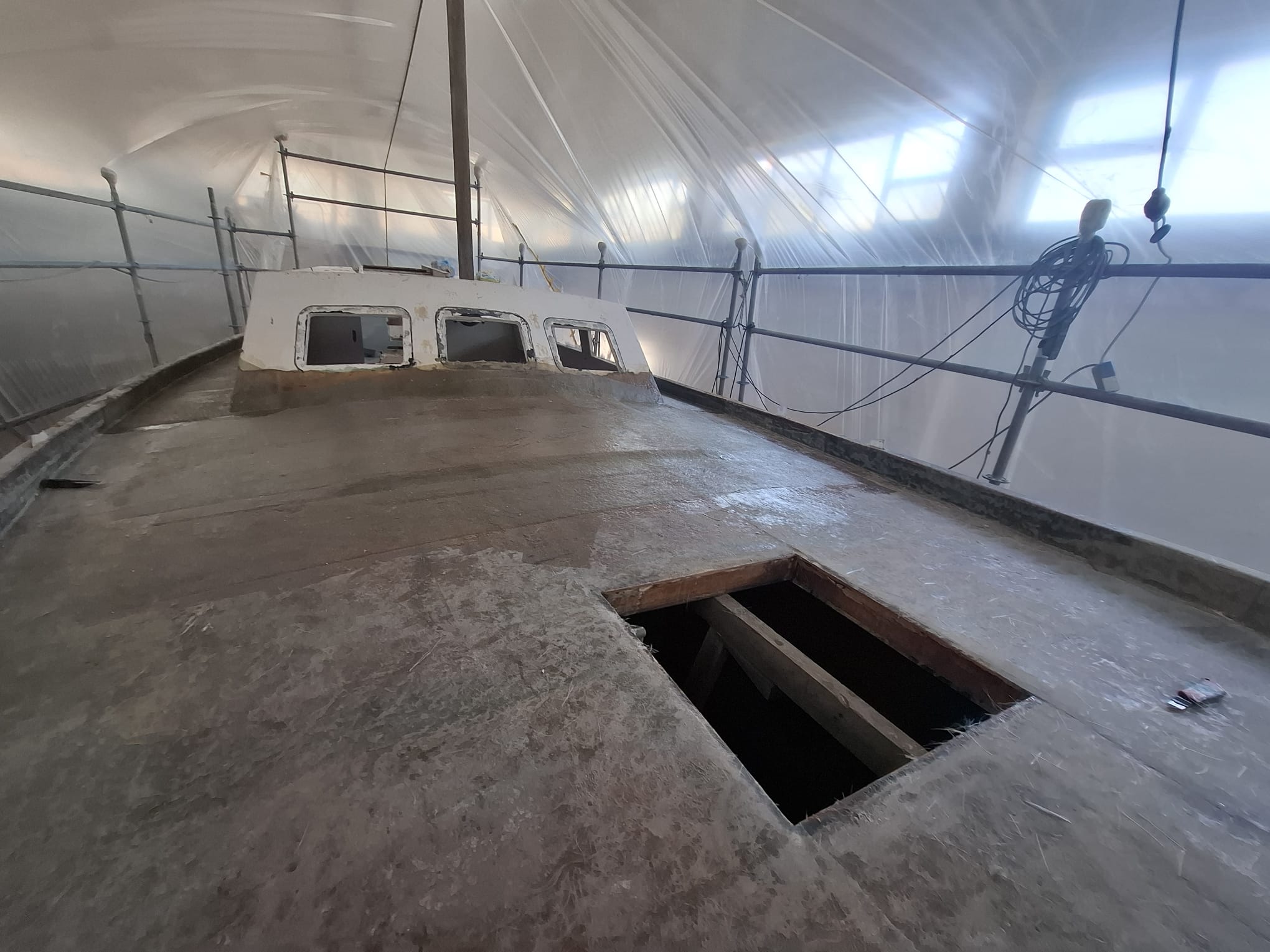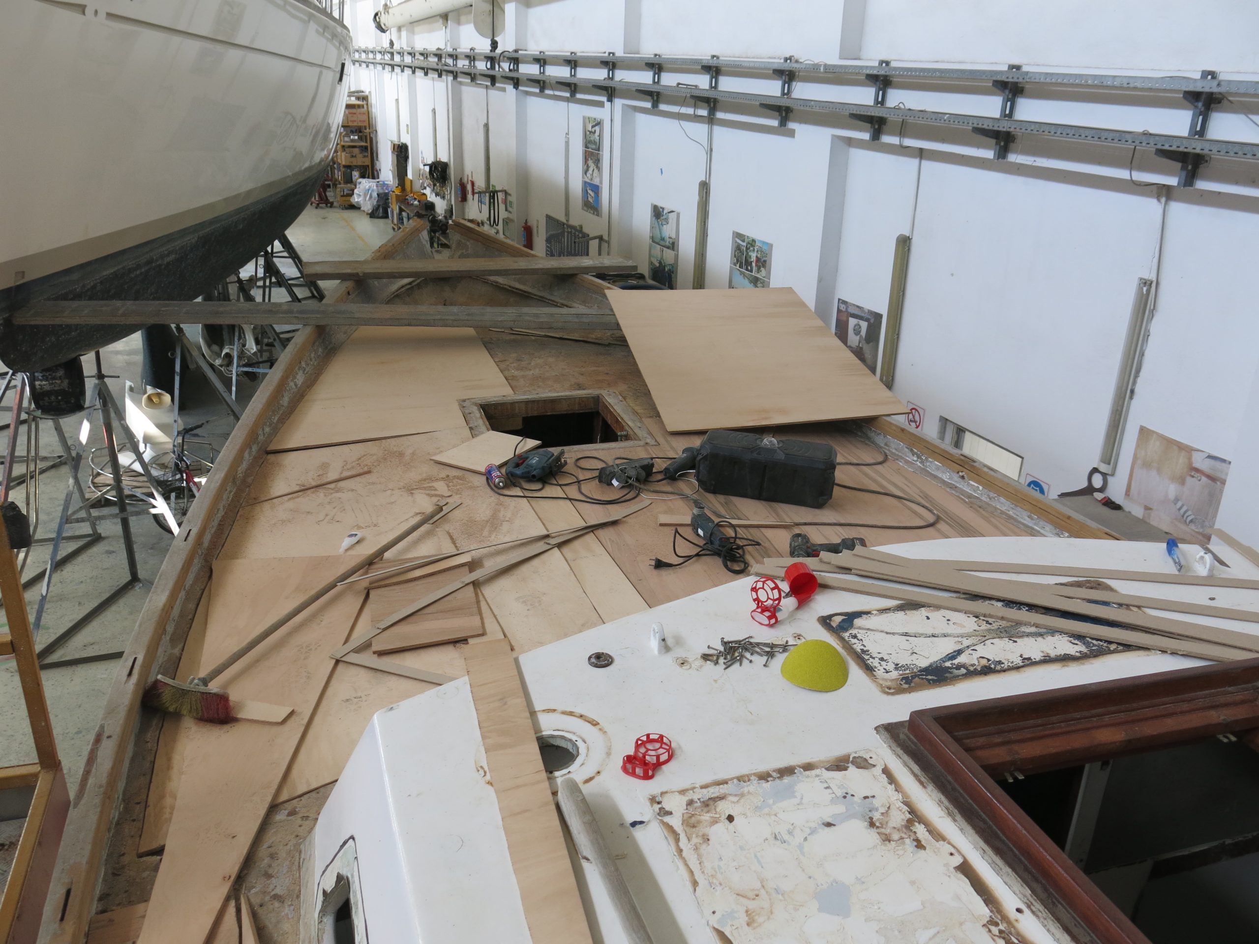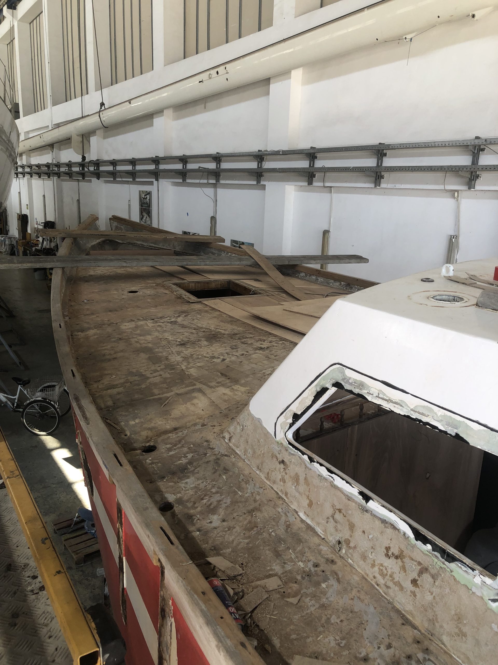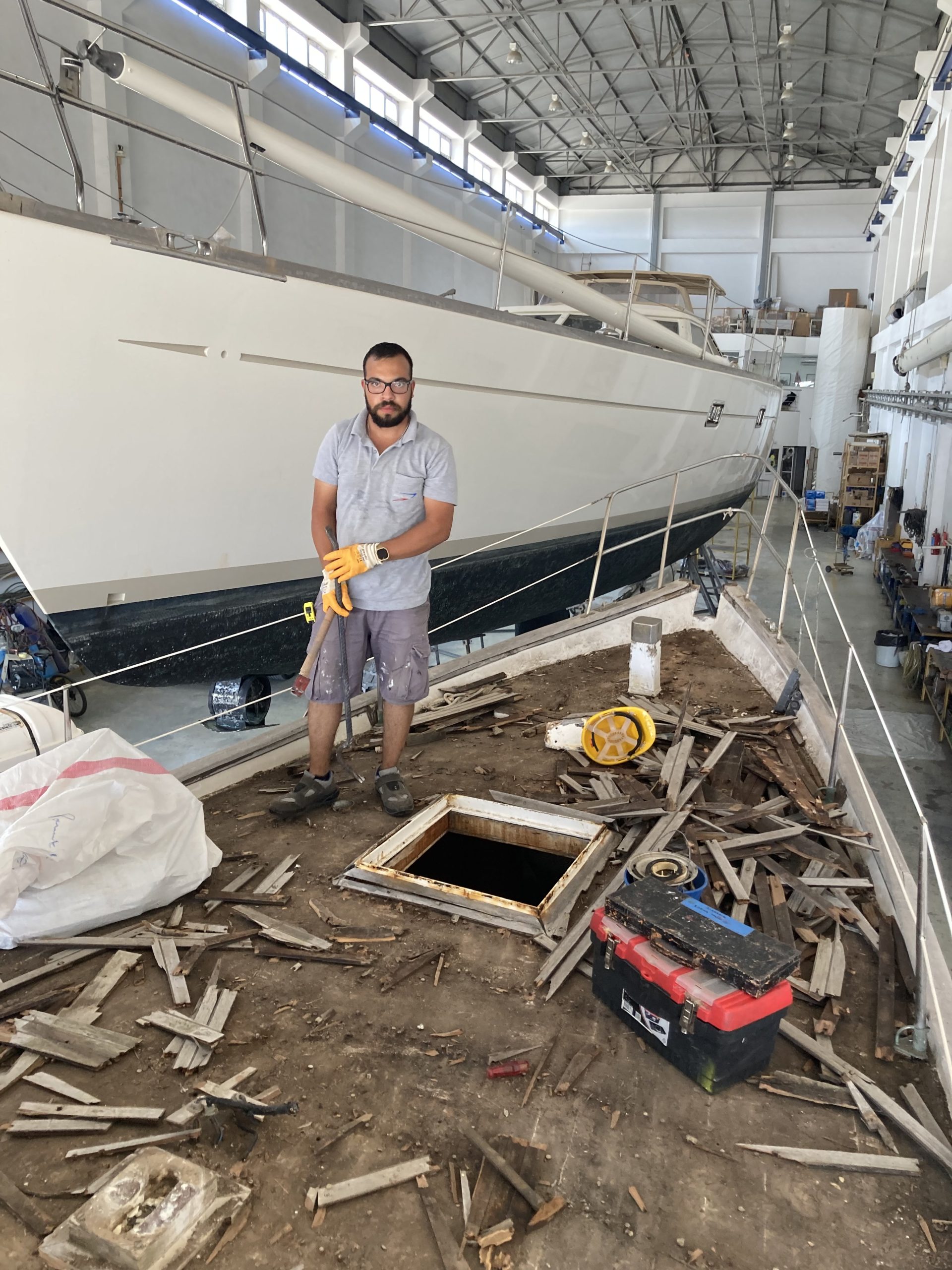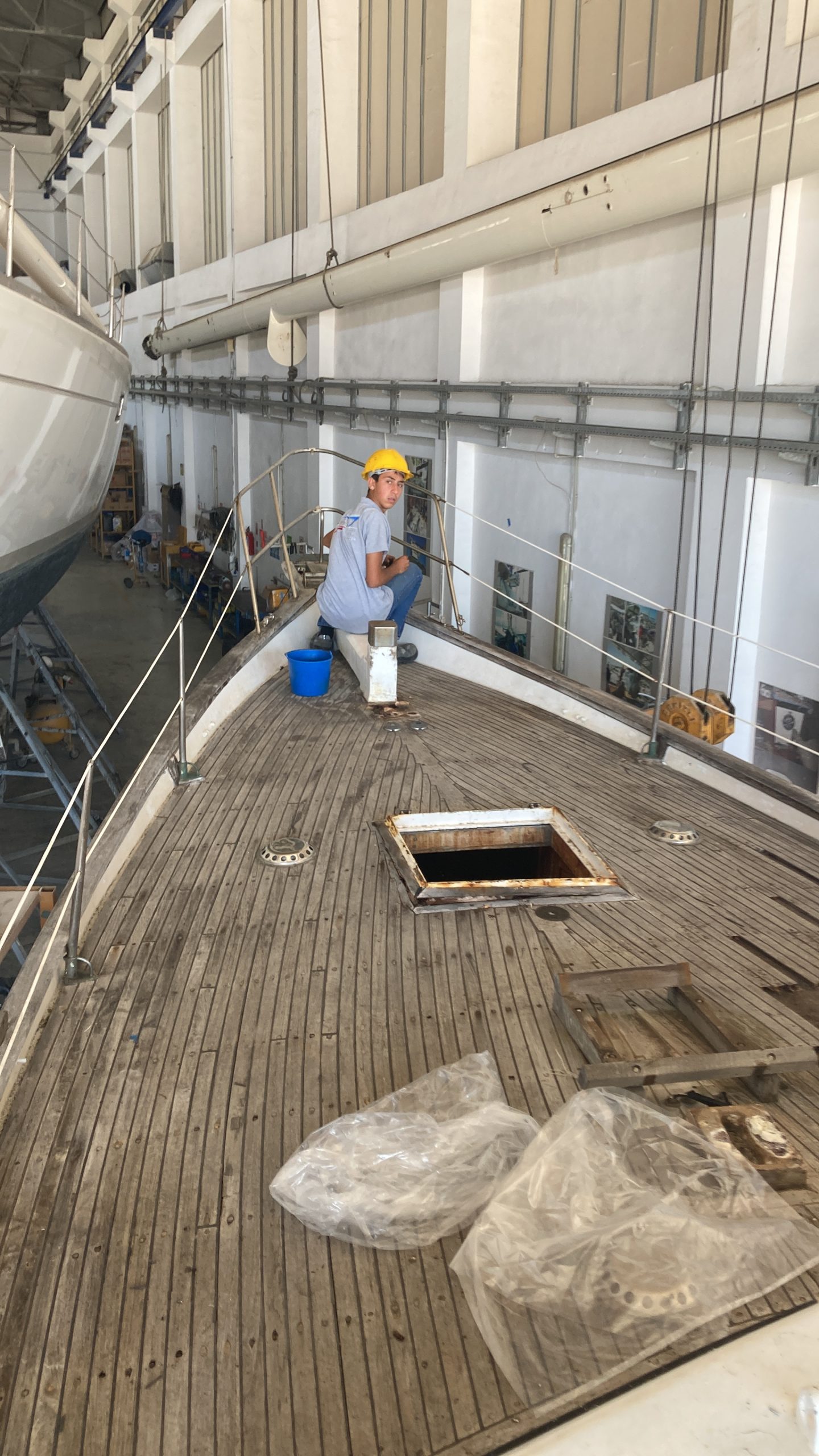 Deck Day 1 – June 5th 2025, transfer to the shedDay 1 – the team starts workingDay 2- Deck clearedDay 6 – Teak removed, down to fiberglassDay 20 – Deck stripped down to the lower layer of fiberglass sandwichDay 21- The balsa in the fiberglass sandwich construction was rotten. So upper layer was removed.Day 22 – Deck was reconstructed on the lower layer of fiberglass sandwich with plywoodDay 28 – Upper layer of fiberglass sandwich reconstructed with polyester resin & fiberglass cloth.Day 32 – Most of the foredeck is coveredDay 34 – More layers of fiberglass cloth & polyester resin appliedMoving on with reconstructing the deckAluminium plates installed on the gunwales for fixing genoa rails and are covered with fiberglassOld large portholes are closed with plywoodEarlier portholes are covered by fiberglass to strengthen cabinGunwales are sanded and covered with fiberglass to act as an external skeletonDay 136 – New smaller portholes are cutDay 136- Mast step area is reinforced with extra layers of plywood and fiberglassDay 152 – Deck is getting ready for paint12 mm plexiglass fixed portholes are prepared for the sides of the cabinDay 149 – Extra cleats are installed midshipsDay 165 – New stanchion bases constructed one by oneDay 165 – Original stanchions ready after polishingDay 168 – Stanchion bases and genoa rails are installedDay 181 – Solar plates are installed with sikaflex, for a tight fit heavy weights are appliedDay 220 – Non-slip paint is prepared locally with granulated corkDay 220 – Granulated corkDay 220 – First layer of non-slip paint on cabin roofDay 221- Application of non-slip paint on deck and cabin roof is finishedClutches are installed on both sides of companion wayClutches are fixed with 6 mm inox bolts & nuts