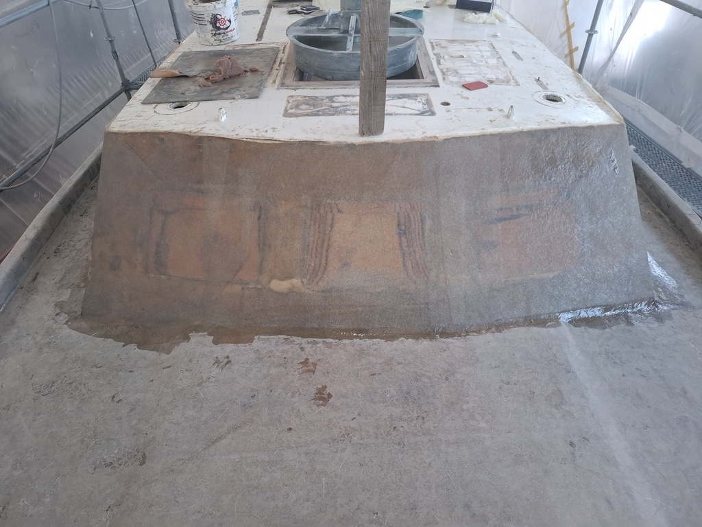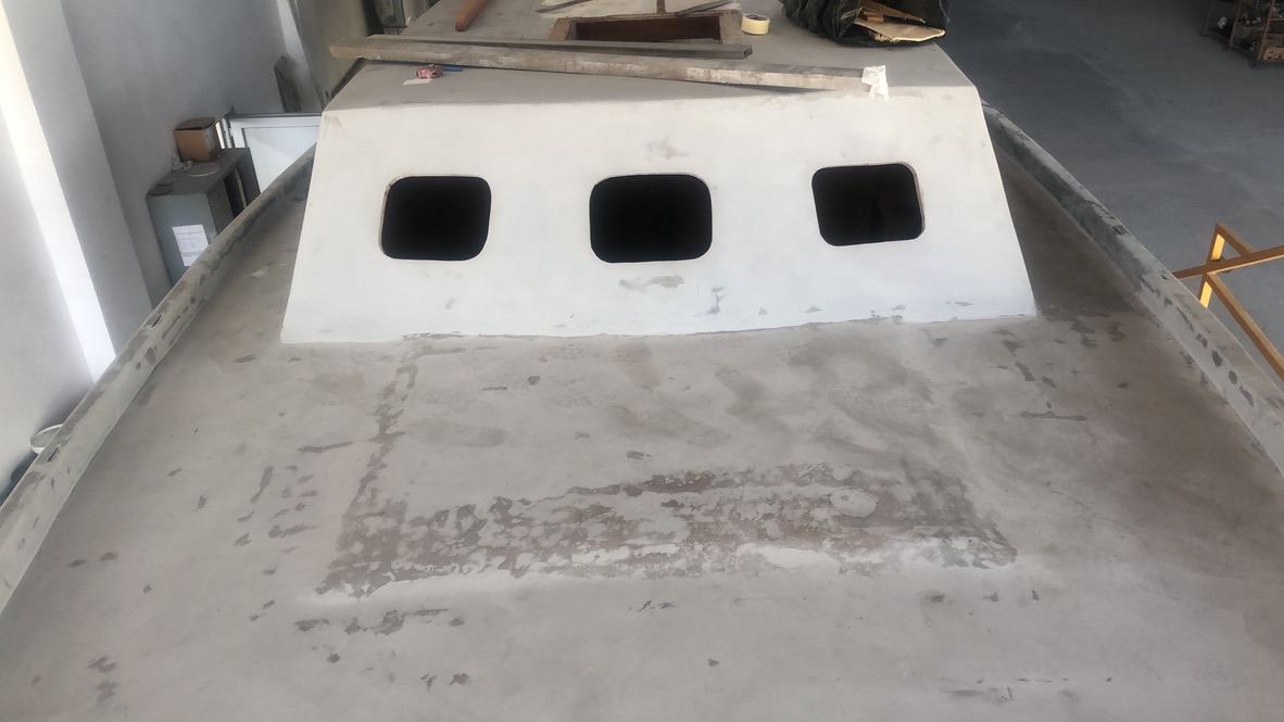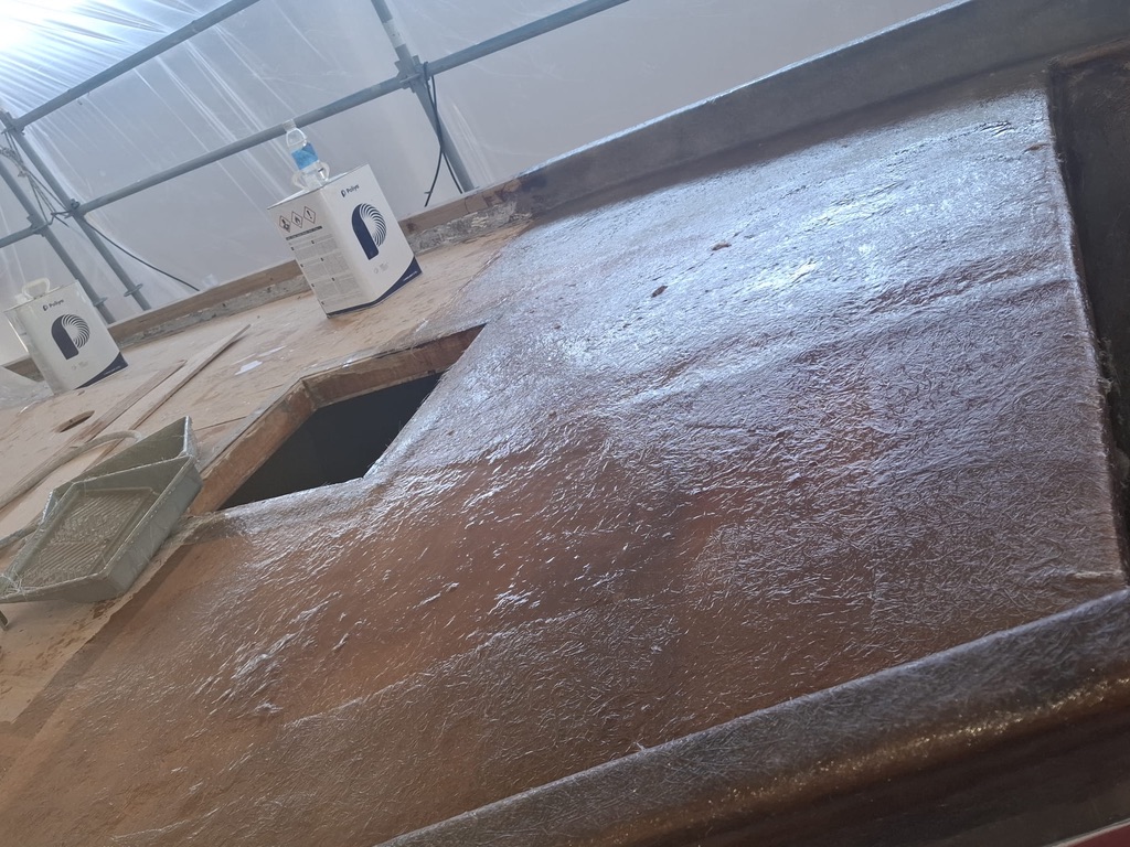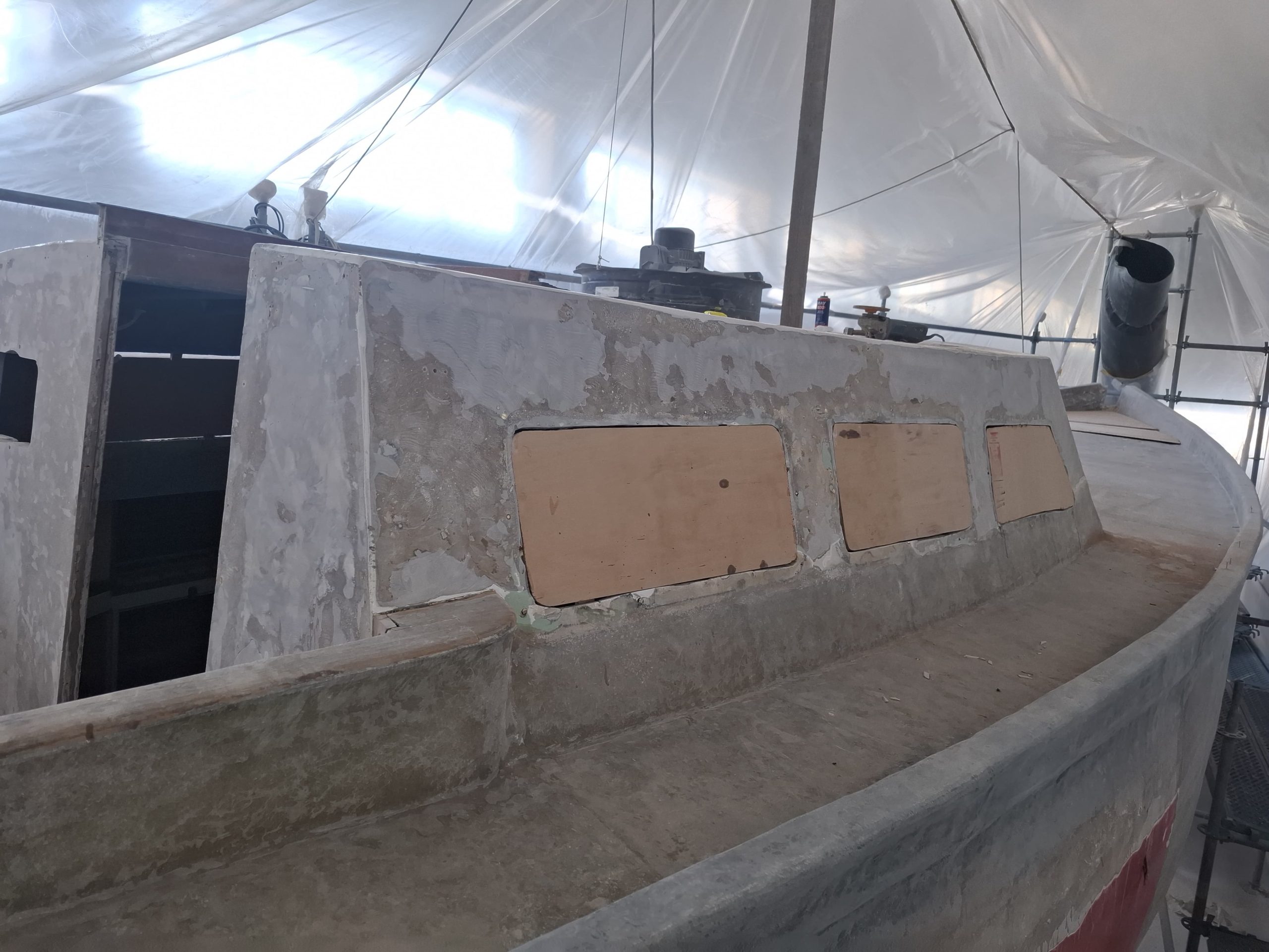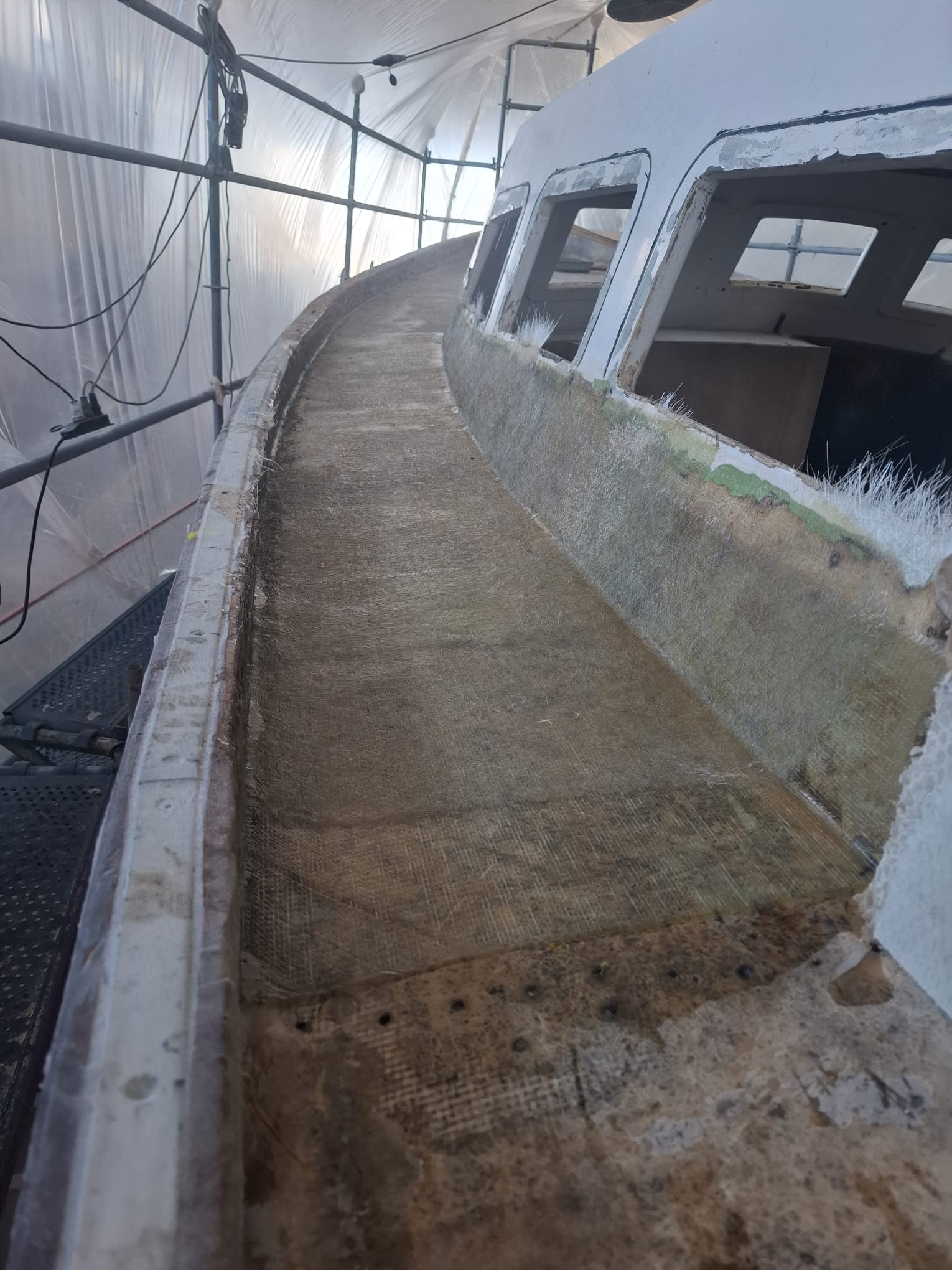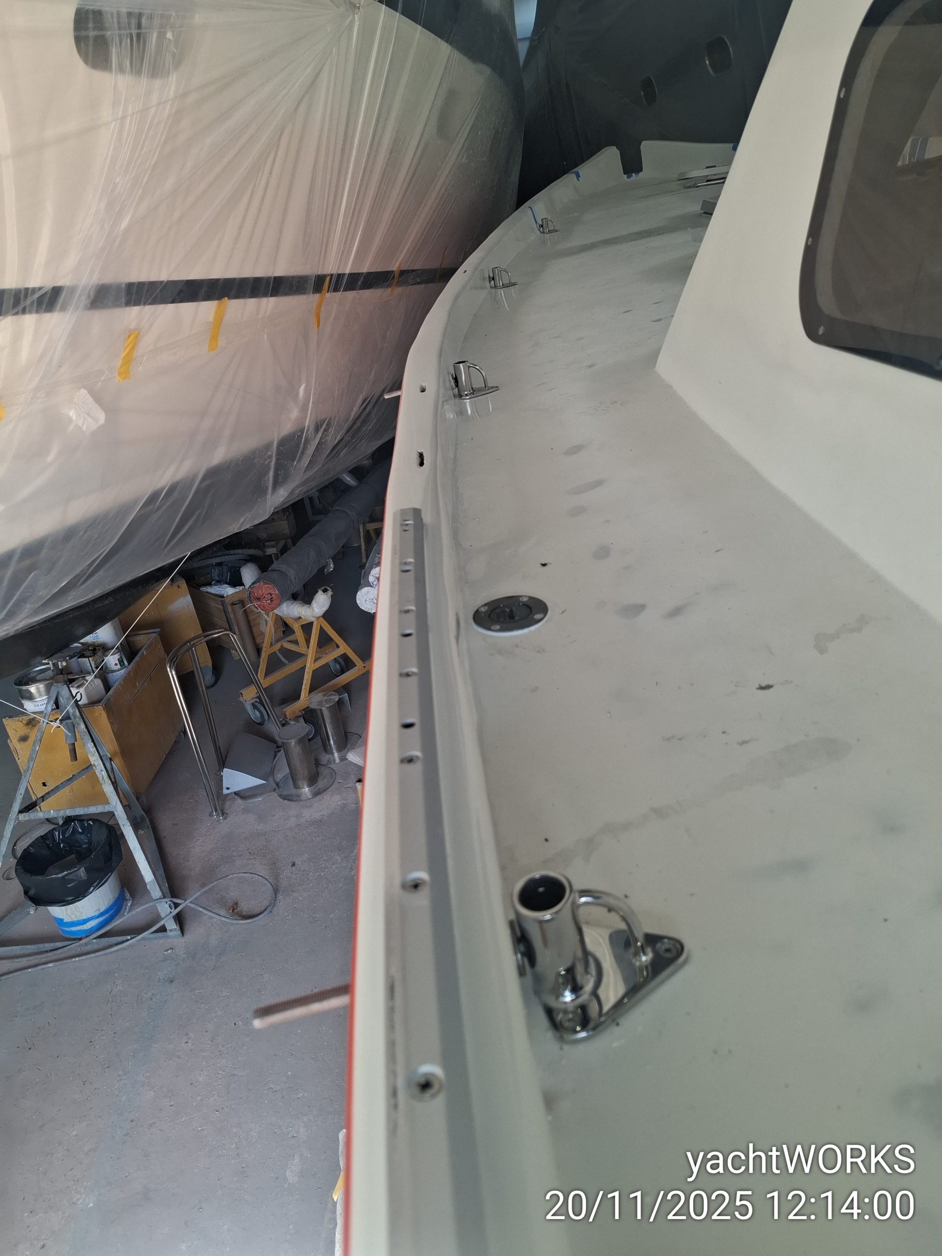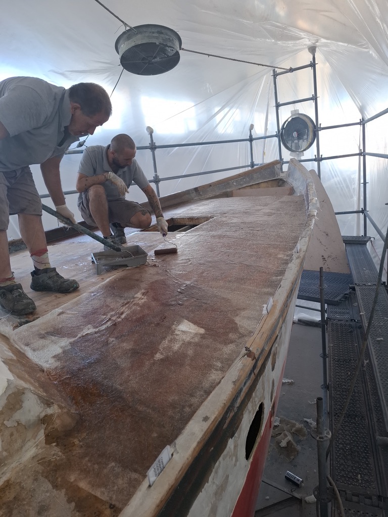Deck Day 1 – June 5th 2025, transfer to the shedDay 1 – the team starts workingDay 2- Deck clearedDay 6 – Teak removed, down to fiberglassDay 20 – Deck stripped down to the lower layer of fiberglass sandwichDay 21- The balsa in the fiberglass sandwich construction was rotten. So upper layer was removed.Day 22 – Deck was reconstructed on the lower layer of fiberglass sandwich with plywoodDay 28 – Upper layer of fiberglass sandwich reconstructed with polyester resin & fiberglass cloth.Day 32 – Most of the foredeck is coveredDay 34 – More layers of fiberglass cloth & polyester resin appliedMoving on with reconstructing the deckAluminium plates installed on the gunwales for fixing genoa rails and are covered with fiberglassOld large portholes are closed with plywoodEarlier portholes are covered by fiberglass to strengthen cabinGunwales are sanded and covered with fiberglass to act as an external skeletonDay 136 – New smaller portholes are cutDay 136- Mast step area is reinforced with extra layers of plywood and fiberglassDay 152 – Deck is getting ready for paint12 mm plexiglass fixed portholes are prepared for the sides of the cabinDay 149 – Extra cleats are installed midshipsDay 165 – New stanchion bases constructed one by oneDay 165 – Original stanchions ready after polishingDay 168 – Stanchion bases and genoa rails are installedDay 181 – Solar plates are installed with sikaflex, for a tight fit heavy weights are appliedDay 220 – Non-slip paint is prepared locally with granulated corkDay 220 – Granulated corkDay 220 – First layer of non-slip paint on cabin roofDay 221- Application of non-slip paint on deck and cabin roof is finishedClutches are installed on both sides of companion wayClutches are fixed with 6 mm inox bolts & nuts
