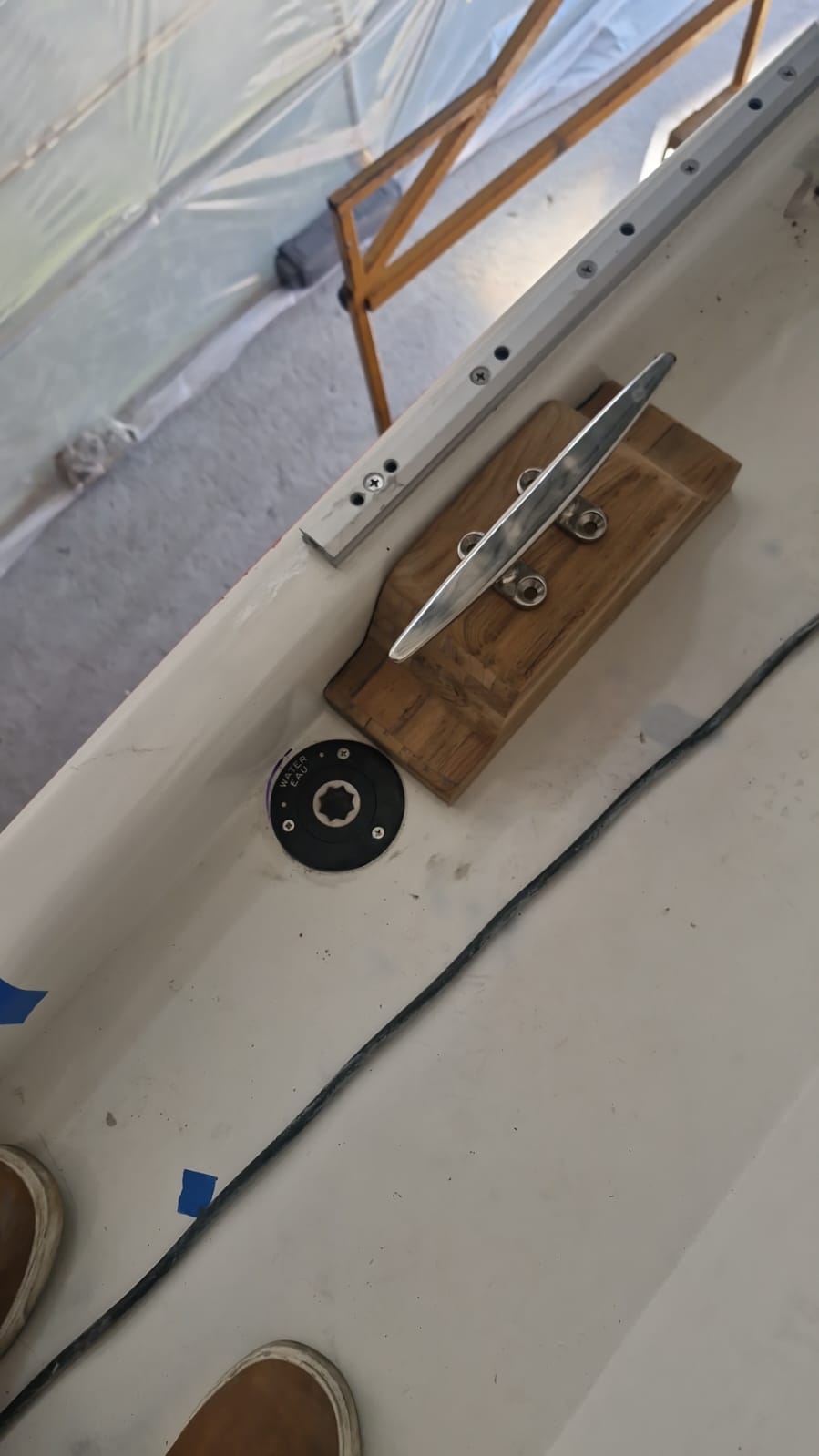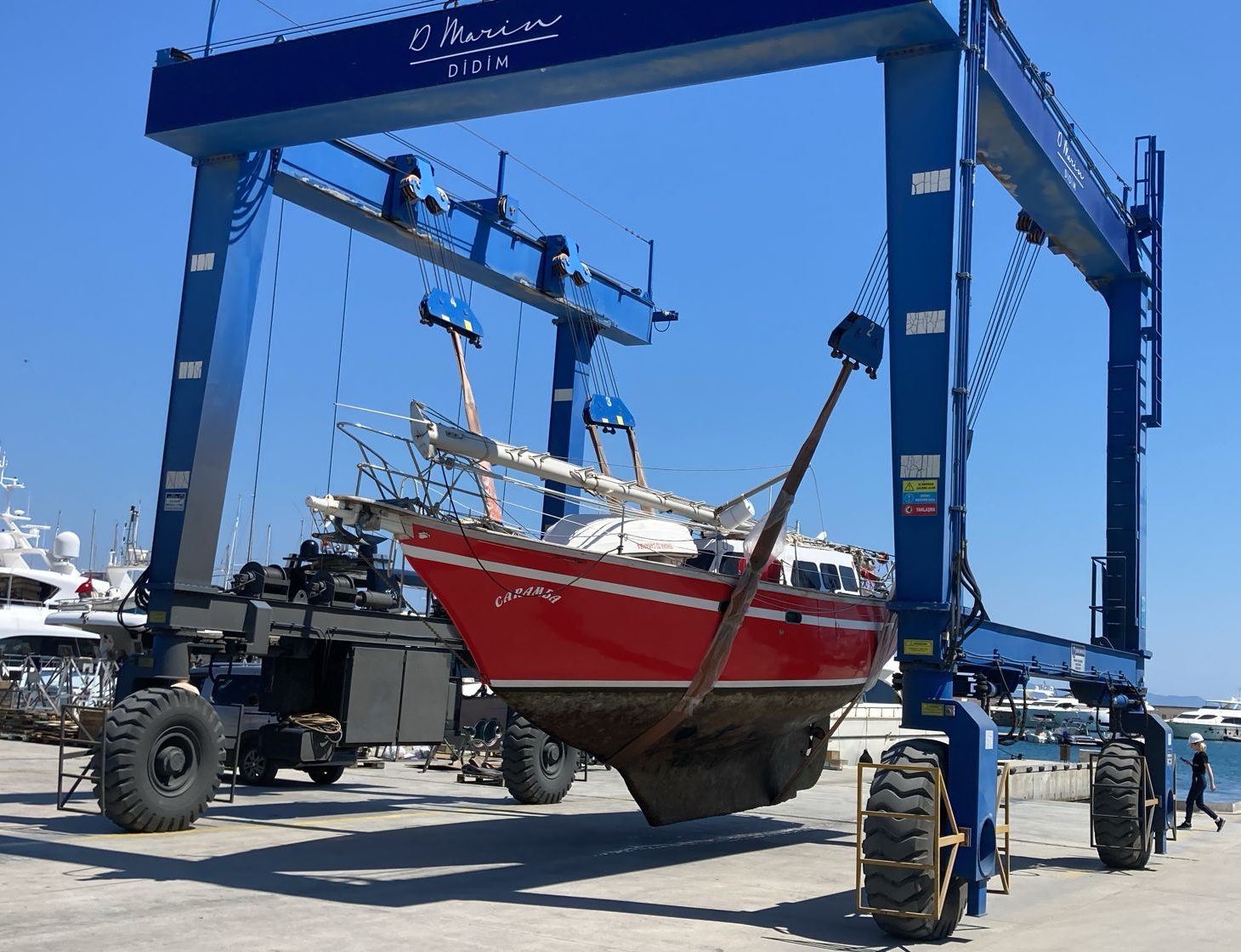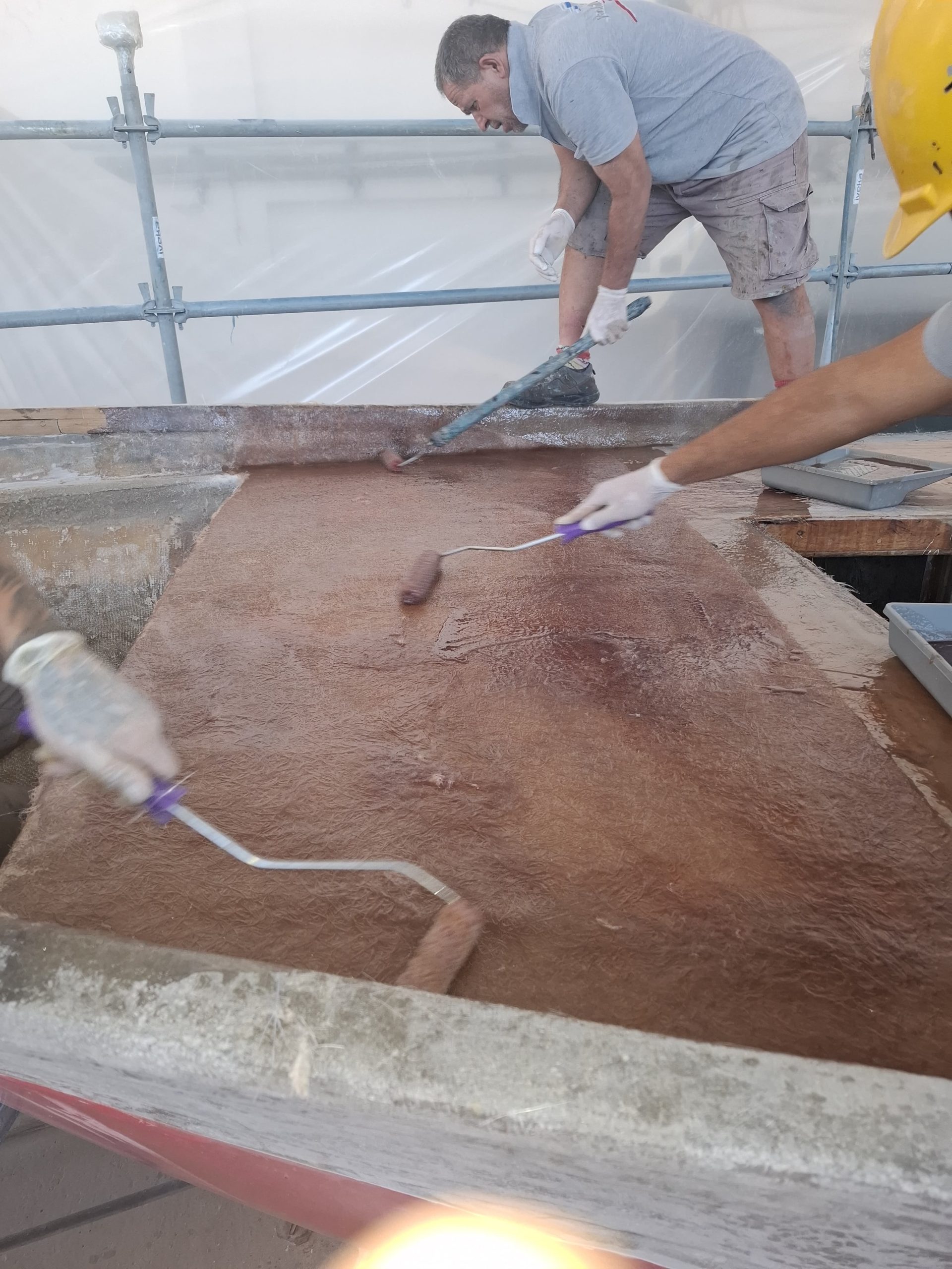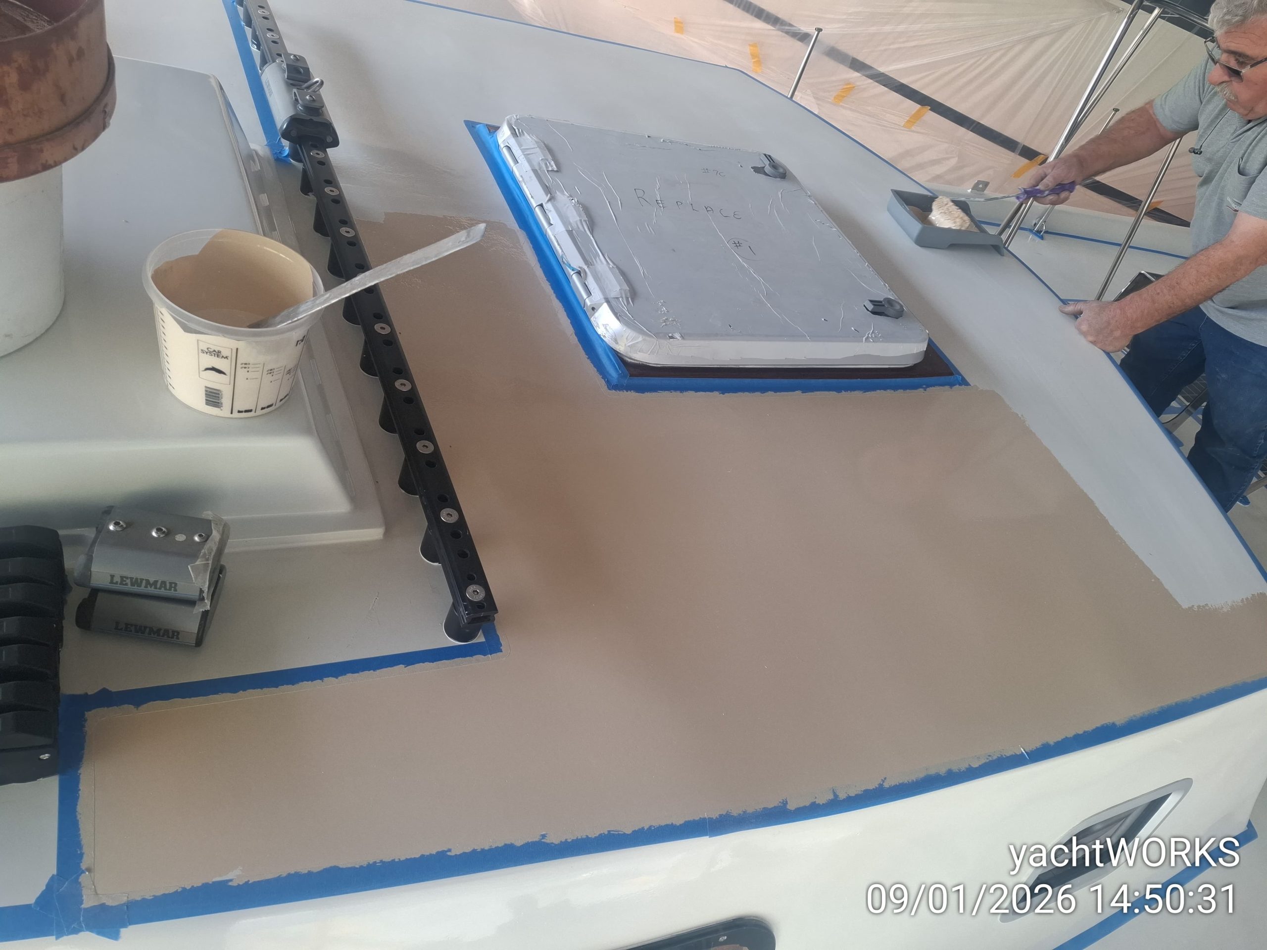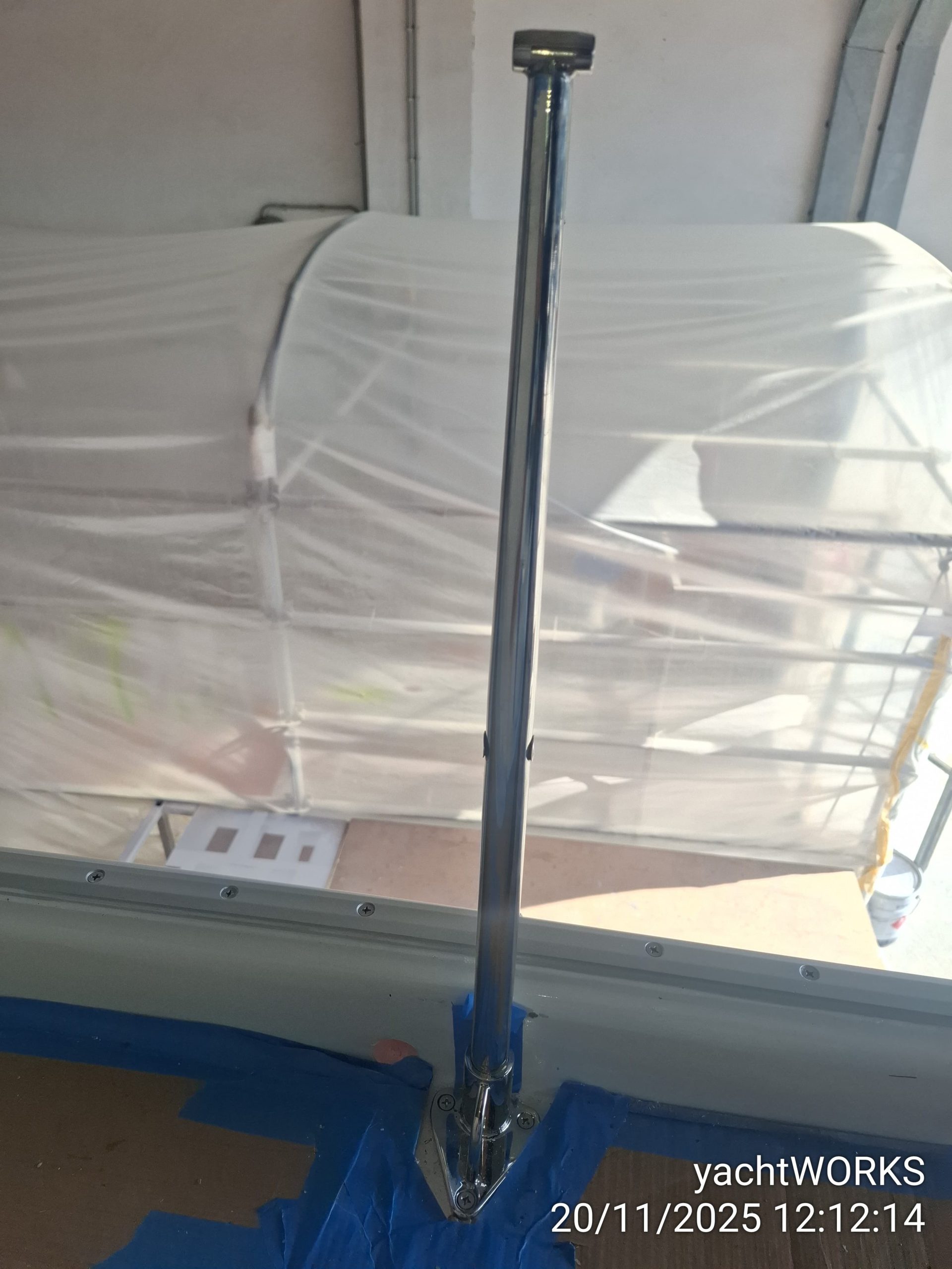 Deck Day 1 – June 5th 2025, transfer to the shedDay 1 – the team starts workingDay 2- Deck clearedDay 6 – Teak removed, down to fiberglassDay 20 – Deck stripped down to the lower layer of fiberglass sandwichDay 21- The balsa in the fiberglass sandwich construction was rotten. So upper layer was removed.Day 22 – Deck was reconstructed on the lower layer of fiberglass sandwich with plywoodDay 28 – Upper layer of fiberglass sandwich reconstructed with polyester resin & fiberglass cloth.Day 32 – Most of the foredeck is coveredDay 34 – More layers of fiberglass cloth & polyester resin appliedMoving on with reconstructing the deckAluminium plates installed on the gunwales for fixing genoa rails and are covered with fiberglassOld large portholes are closed with plywoodEarlier portholes are covered by fiberglass to strengthen cabinGunwales are sanded and covered with fiberglass to act as an external skeletonDay 136 – New smaller portholes are cutDay 136- Mast step area is reinforced with extra layers of plywood and fiberglassDay 152 – Deck is getting ready for paint12 mm plexiglass fixed portholes are prepared for the sides of the cabinDay 149 – Extra cleats are installed midshipsDay 165 – New stanchion bases constructed one by oneDay 165 – Original stanchions ready after polishingDay 168 – Stanchion bases and genoa rails are installedDay 181 – Solar plates are installed with sikaflex, for a tight fit heavy weights are appliedDay 220 – Non-slip paint is prepared locally with granulated corkDay 220 – Granulated corkDay 220 – First layer of non-slip paint on cabin roofDay 221- Application of non-slip paint on deck and cabin roof is finishedClutches are installed on both sides of companion wayClutches are fixed with 6 mm inox bolts & nuts