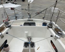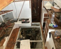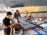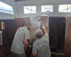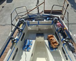 When the team of Yachtworks started to dismantle the deck, we realized that the balsa core of the fiberglass sandwich construction was rotten, so they had to remove the upper polyester layer, and reconstruct it with plywood. Later the whole deck was covered with polyester. The bases of all the stanchions, chainplates, tracks and clutches, winches, bowspirit and the pulpits were reinforced with extra layers of fiberglass with aluminium plates in between wherever necessary.