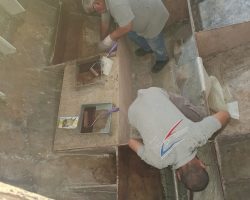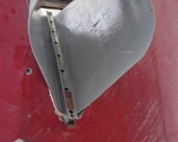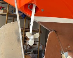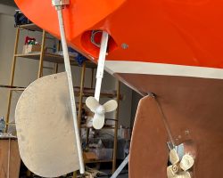 The propeller shaft was removed, the propeller shaft housing and cutlass bearing were replaced, folding propeller that came from our boat Keyif was installed. The original rudder blade was sandblasted, strenghtened and covered with fiberglass.