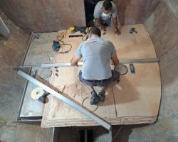 He also had our carpenter Fatih Şeren to prepare compartments for the diesel and water tanks which would also serve as an inner skeleton for the hull when covered with fiberglass. Selim made very precise, 3D templates from cardboard, computerized images were drawn from these templates by our engineer Çağlar and tanks were manufactured from 2 mm stainless steel plates again by Murat Aydın.