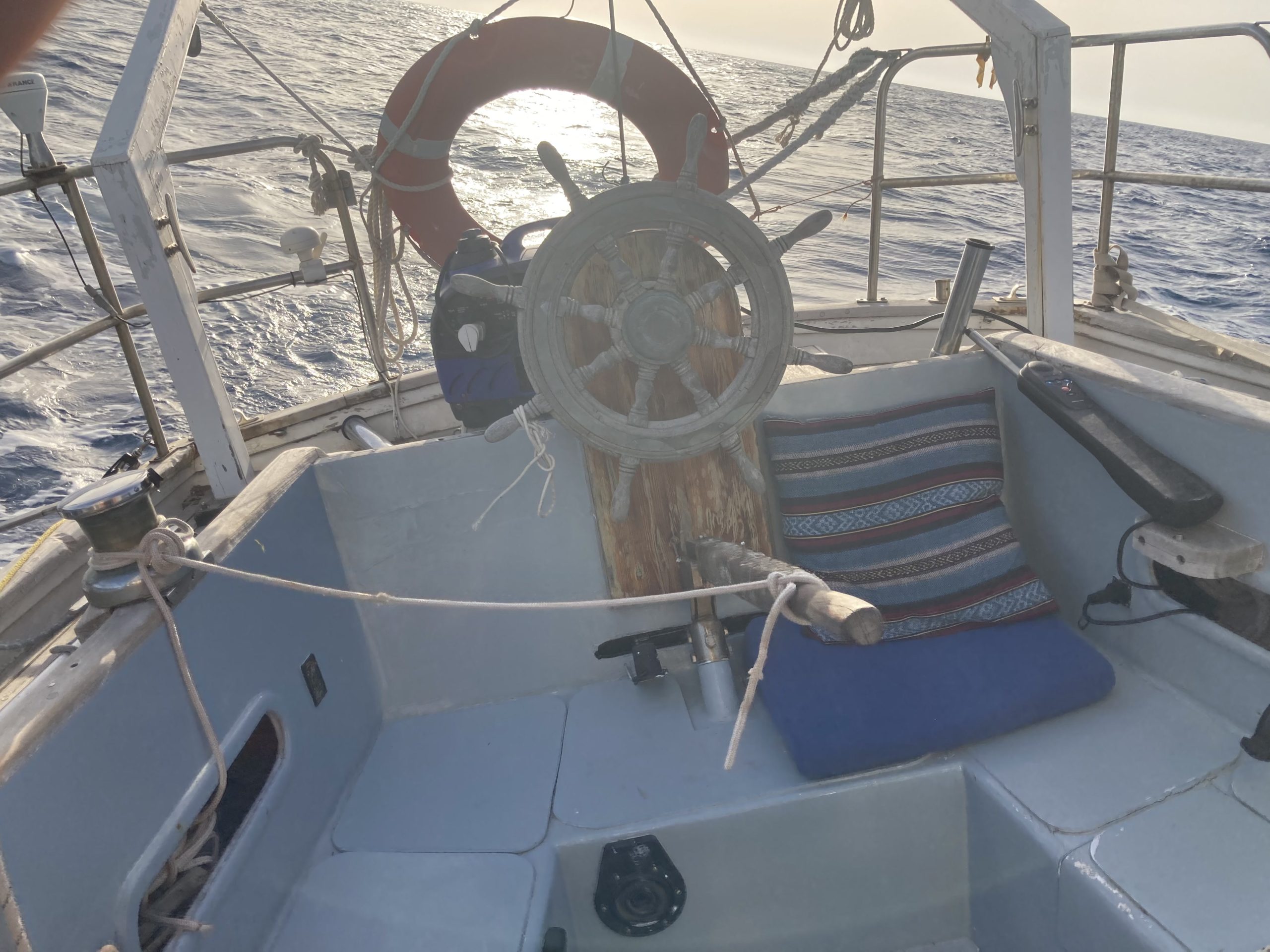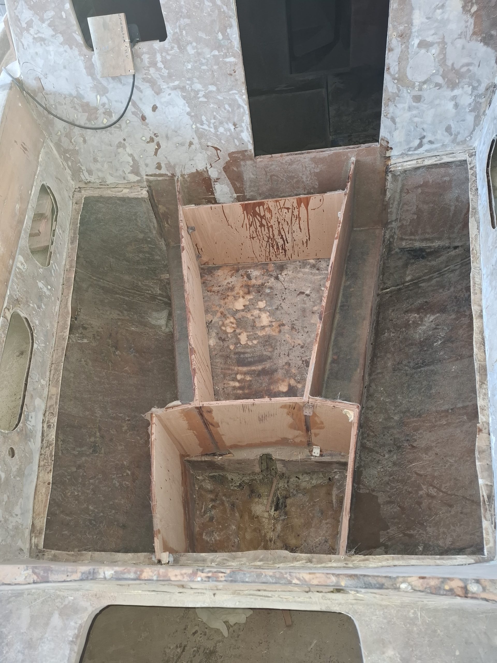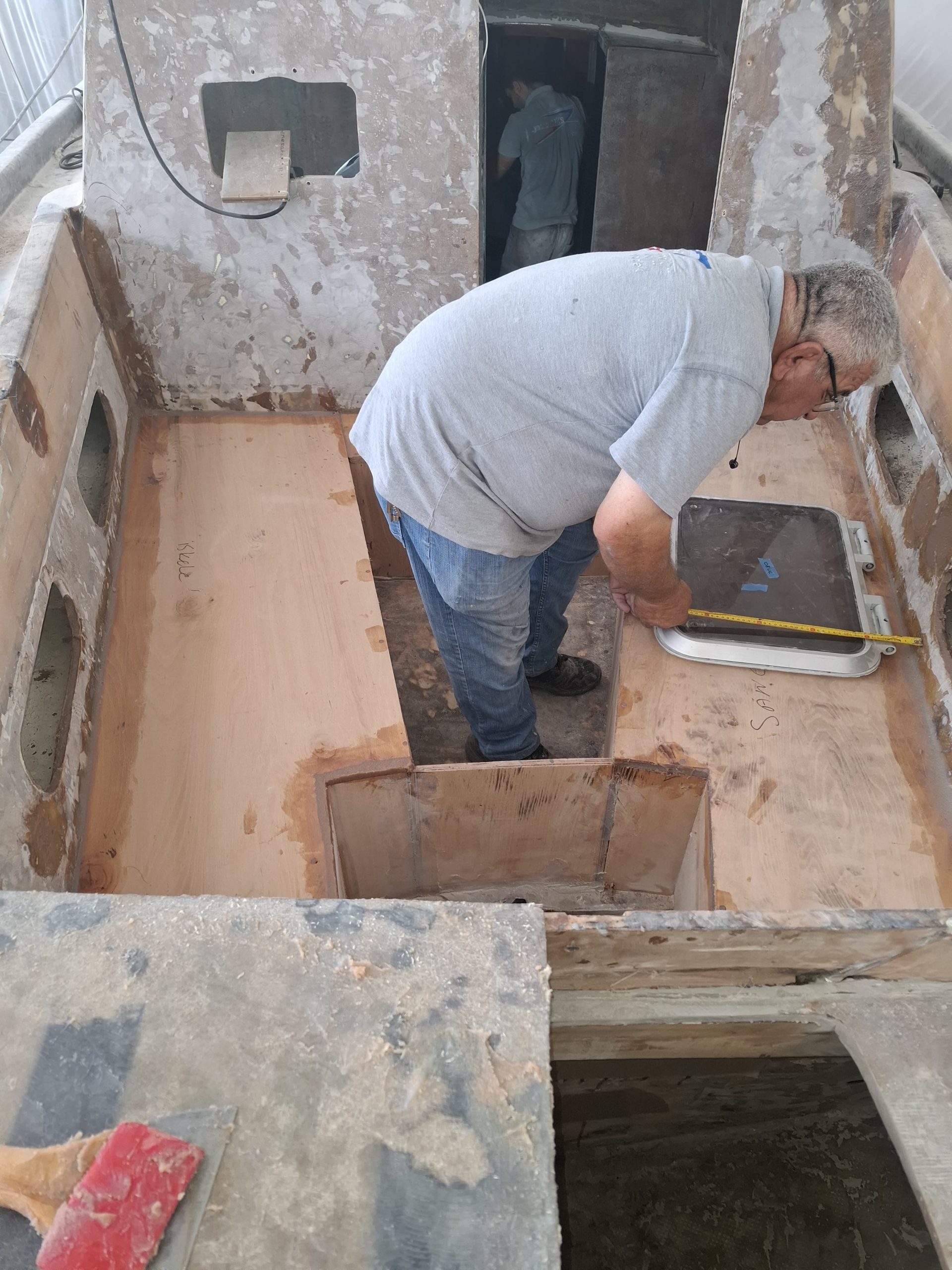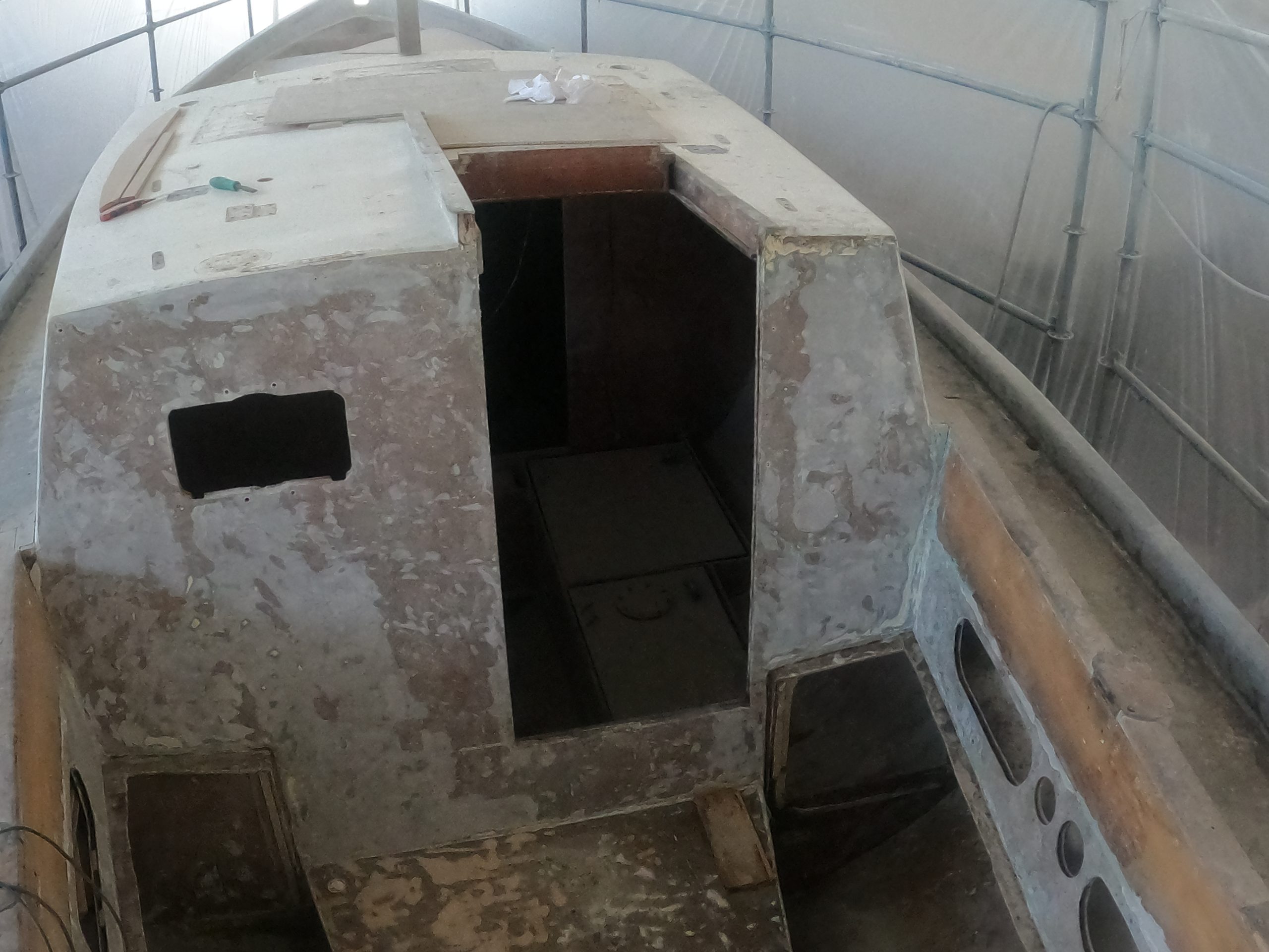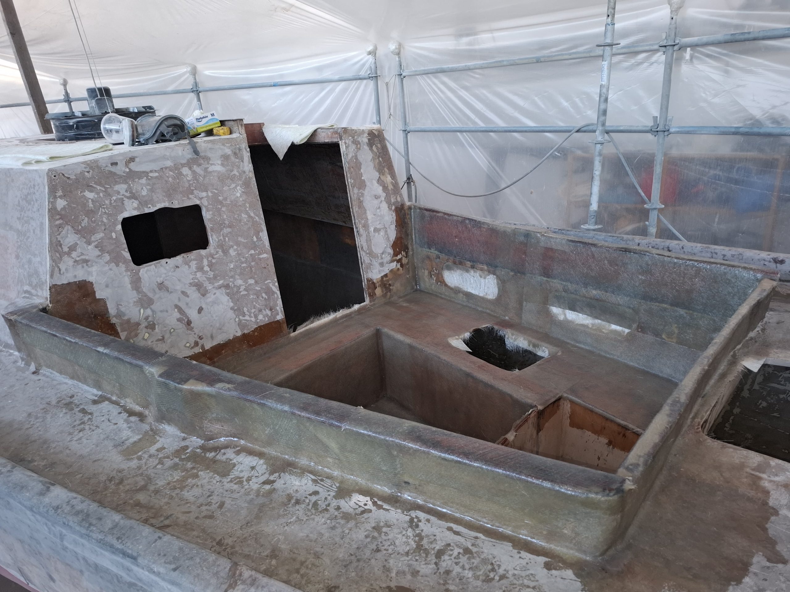 The cockpit and the companionway were completely redone. According to the GGR rules, the lockers were reconstructed to be totally waterproof. The cockpit base was strengthened with frames and everything was covered with fiberglass.