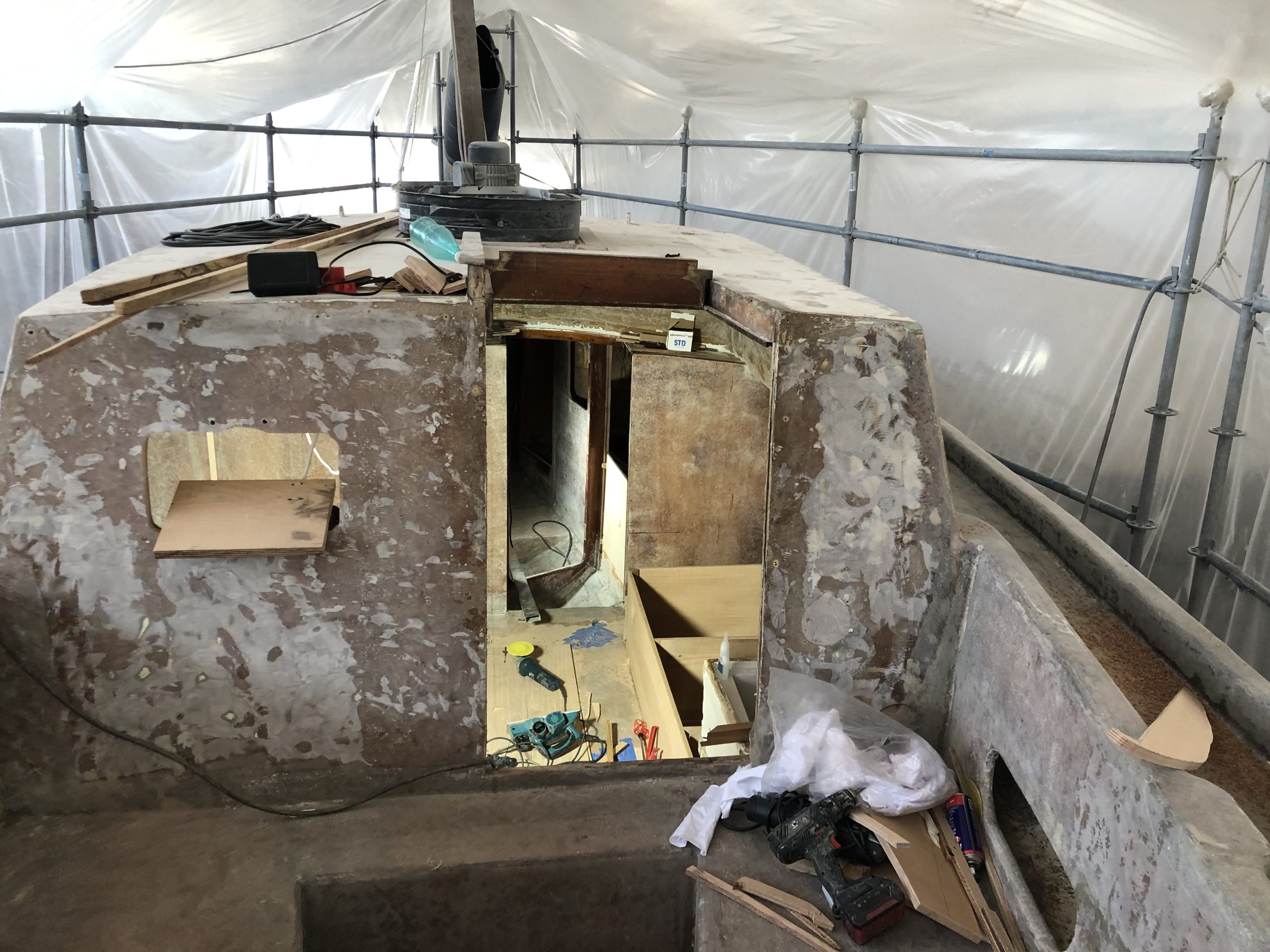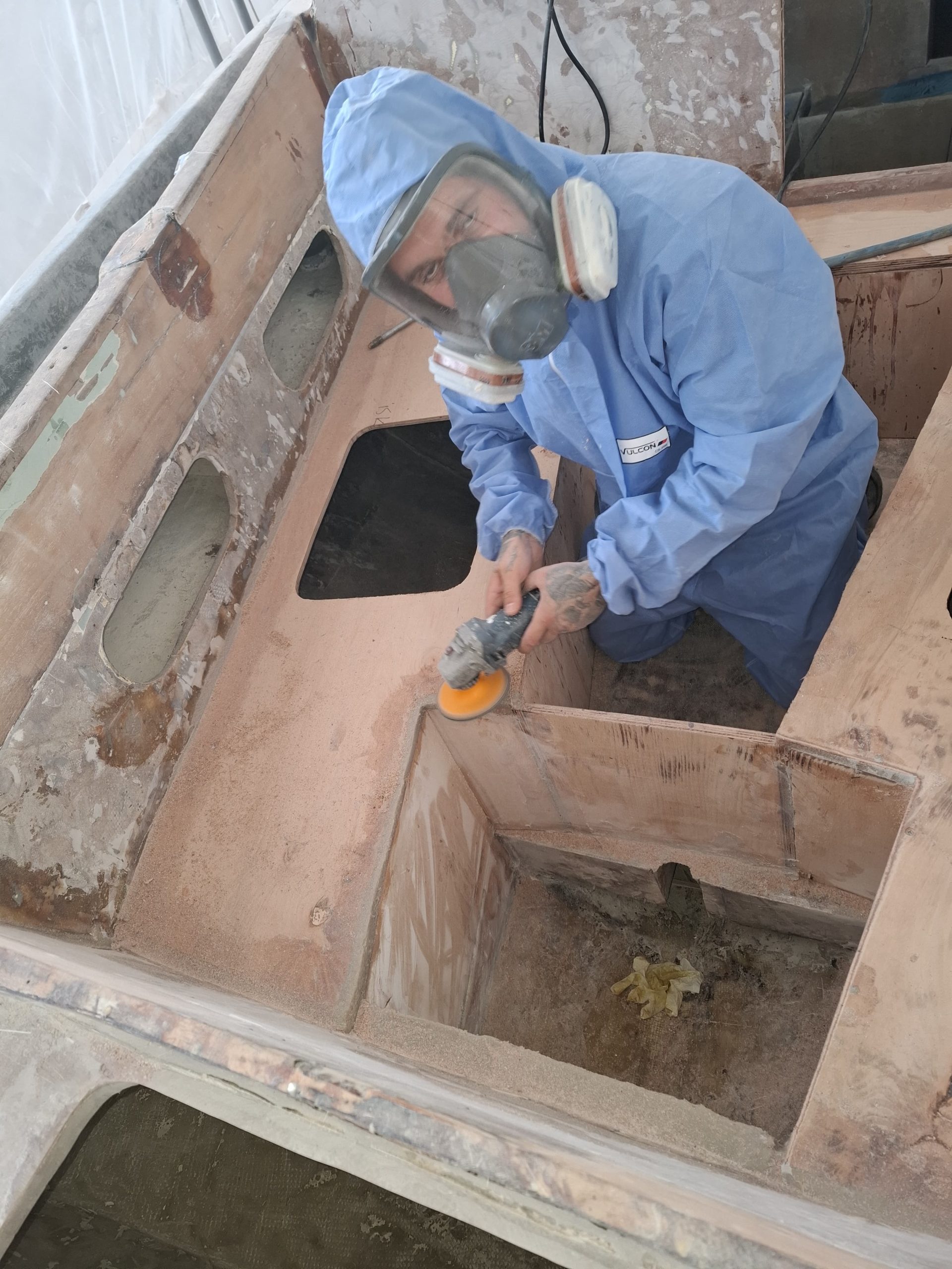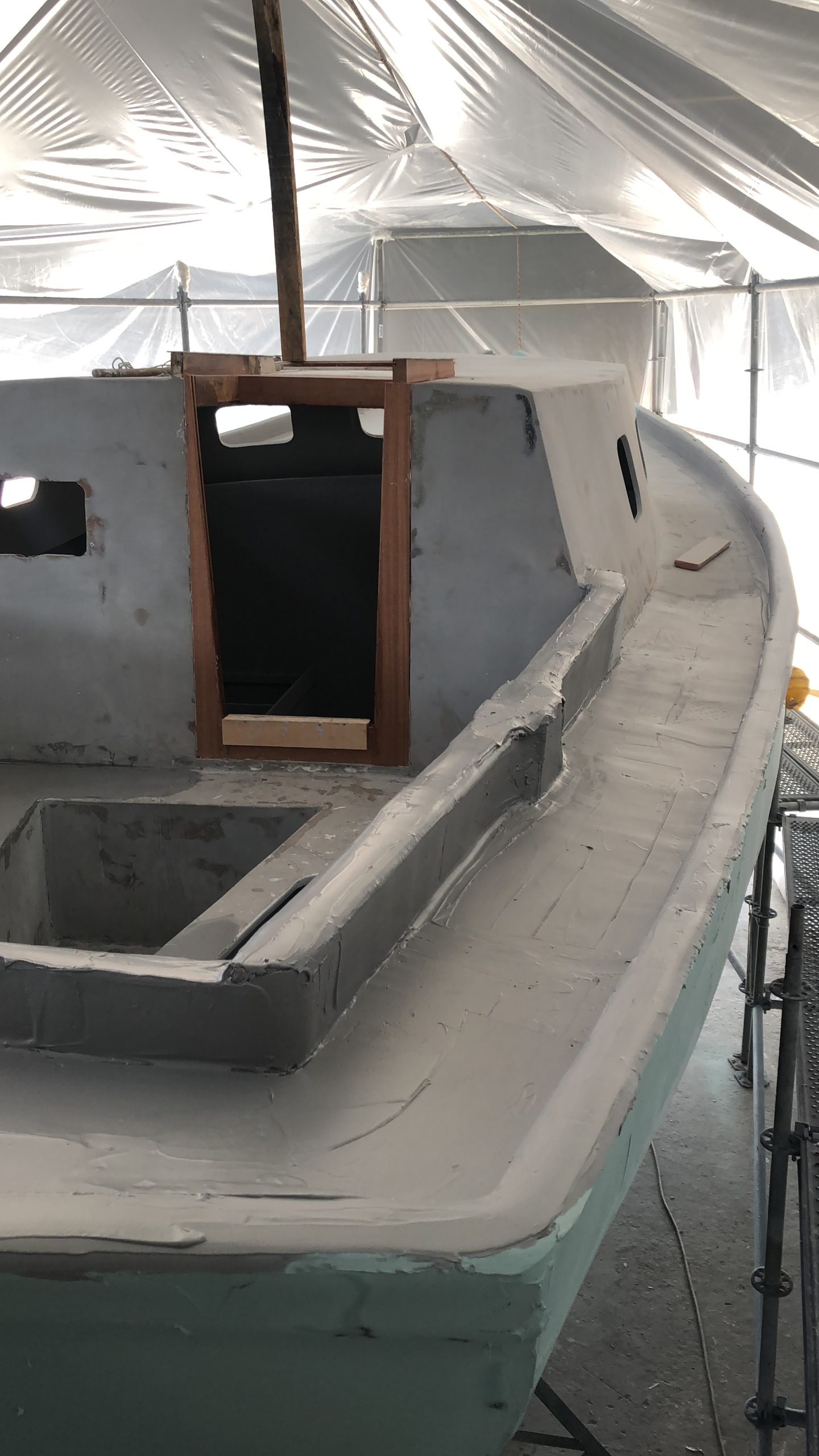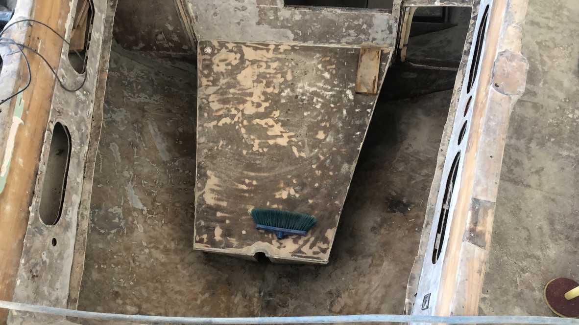 The old paint was removed and the hull was strengthened by extra layers of fiberglass. The bottom was painted with coppercoat.