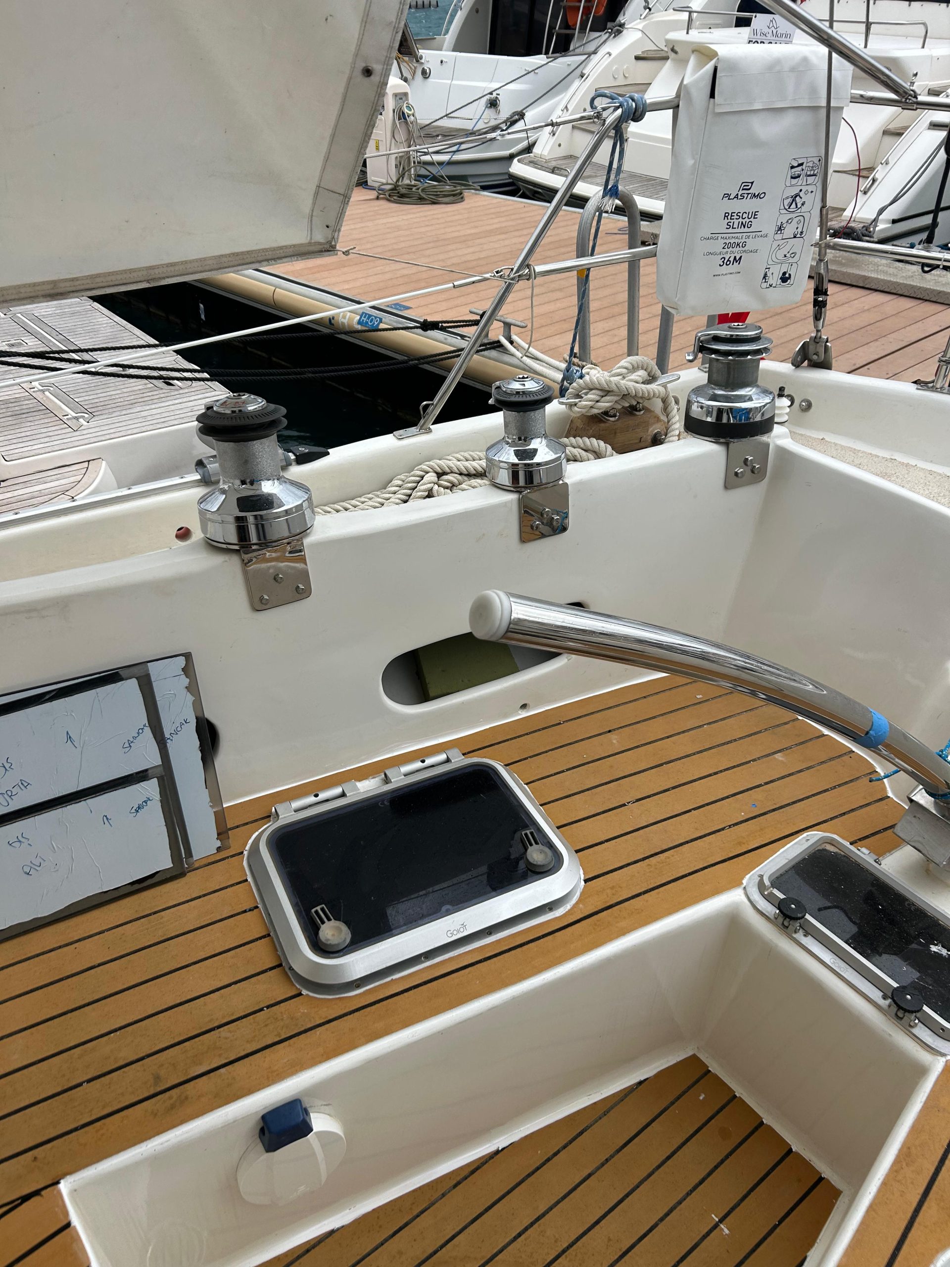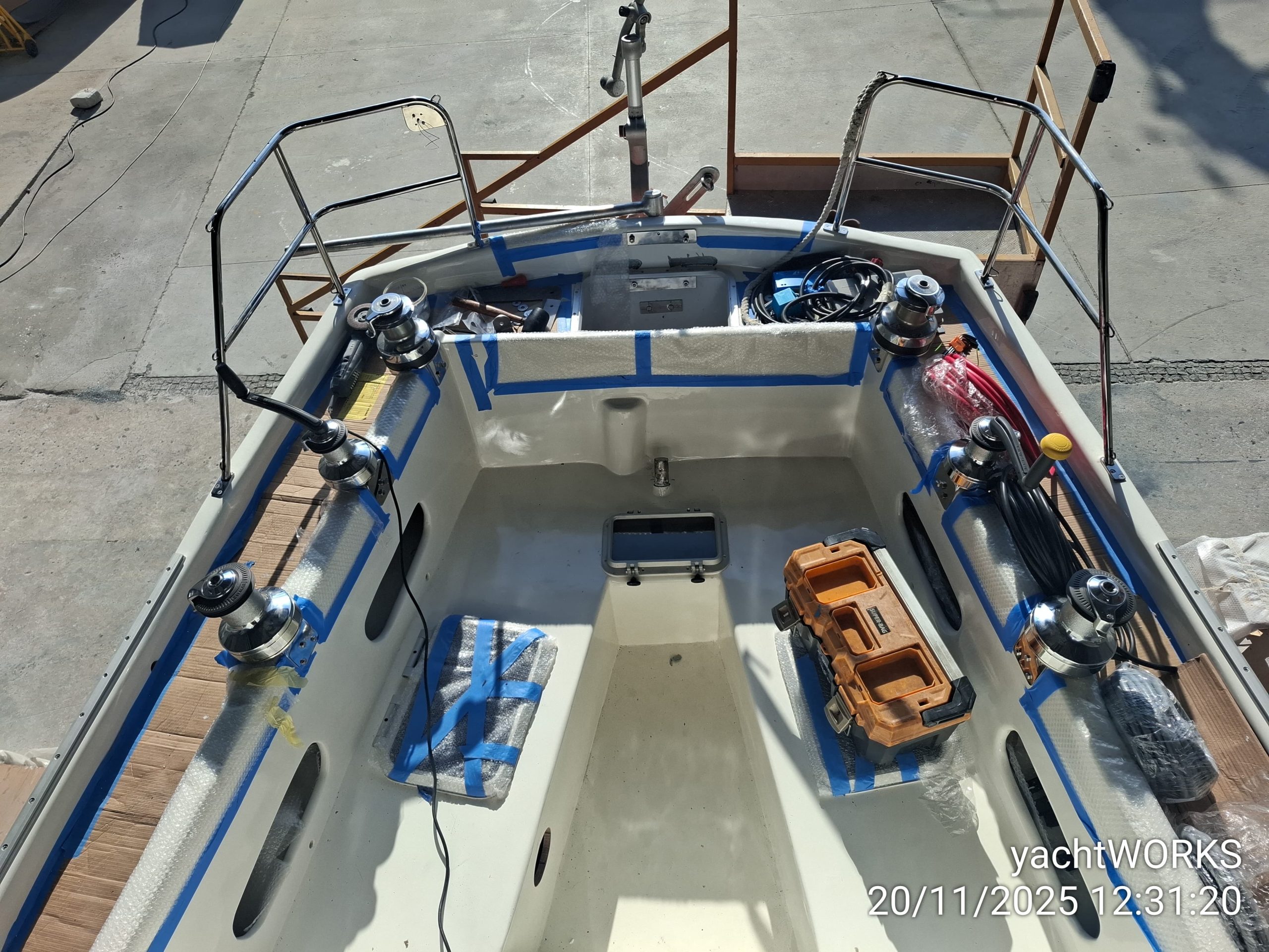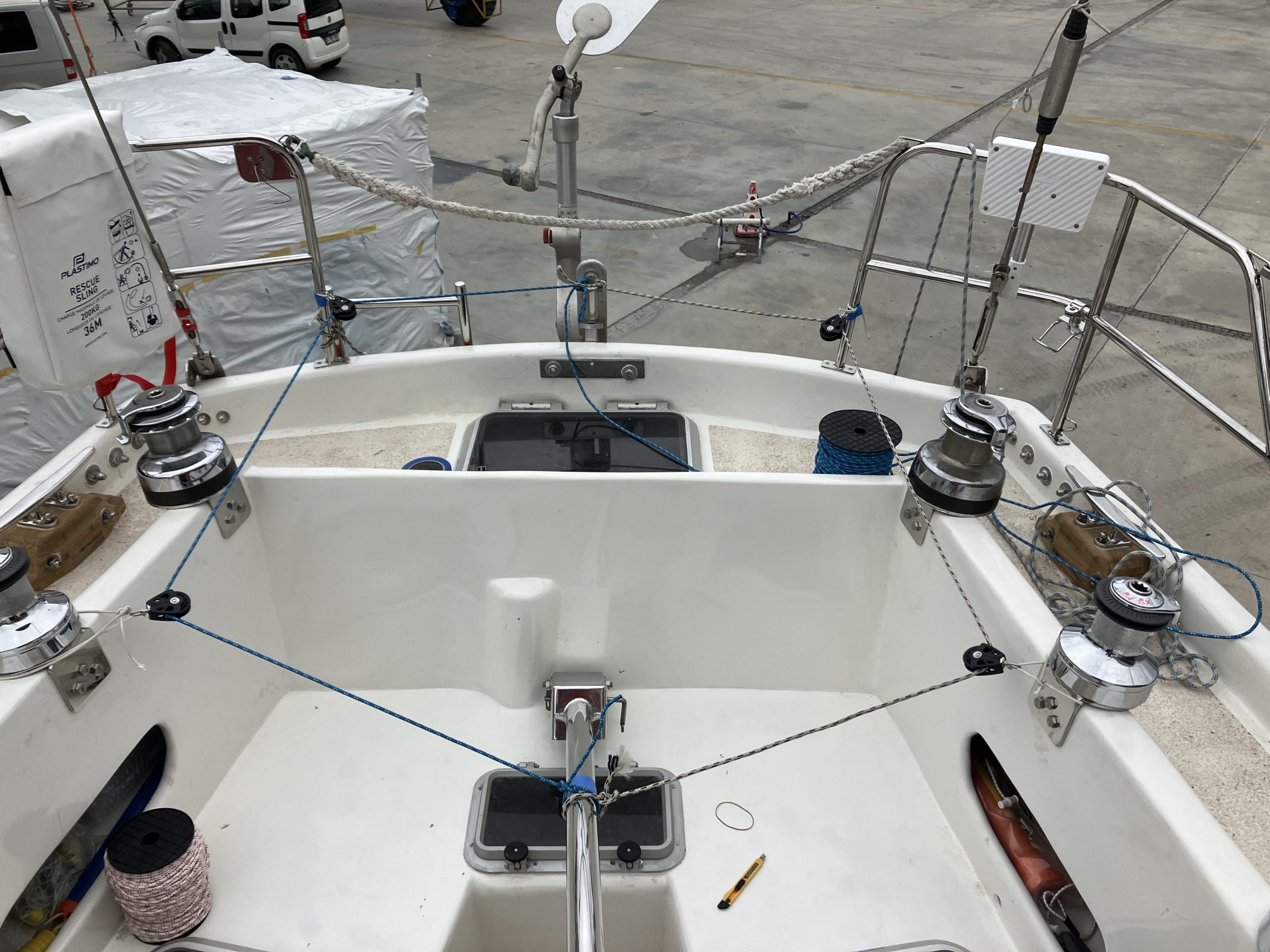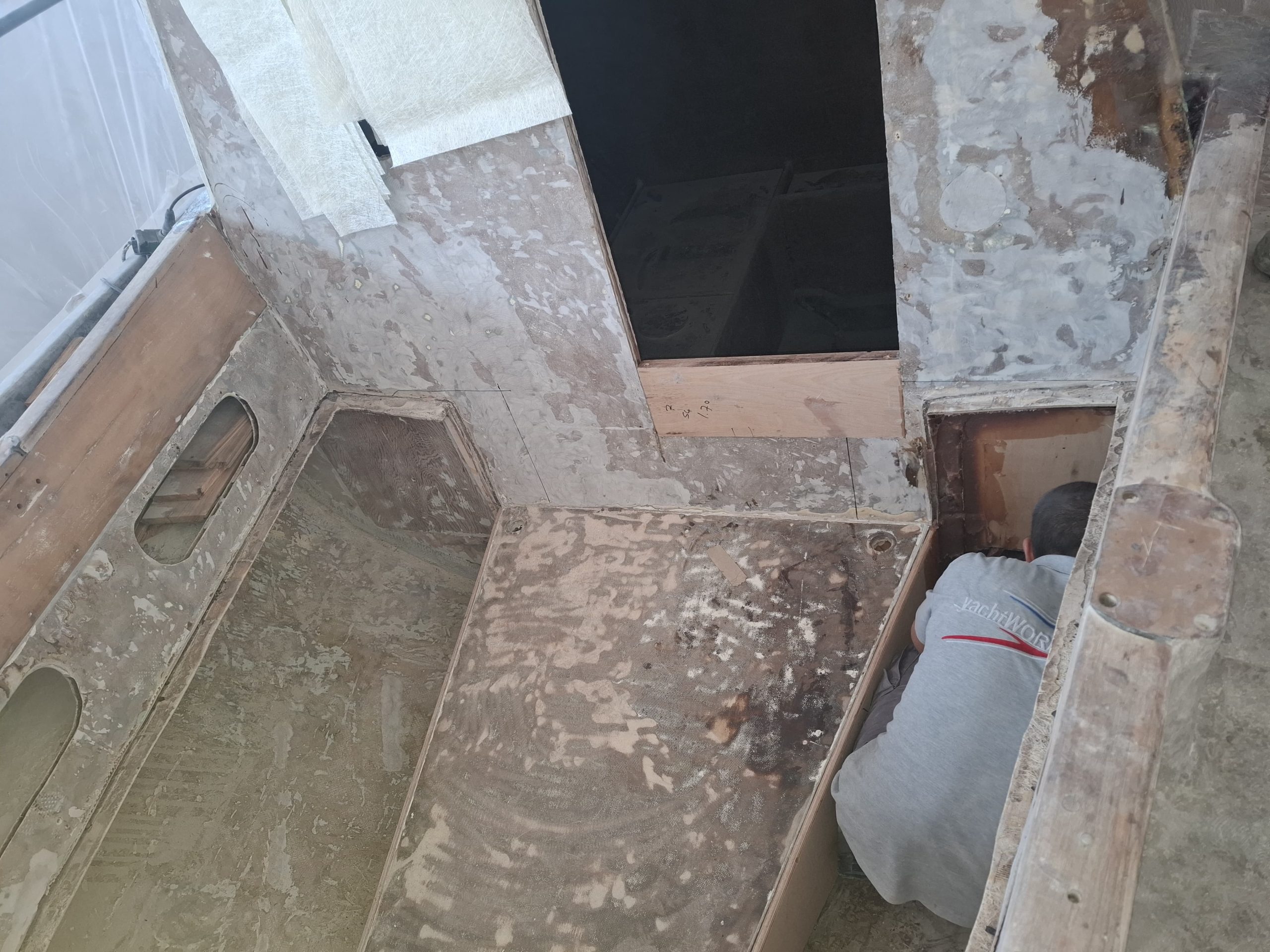 When the team of Yachtworks started to dismantle the deck, we realized that the balsa core of the fiberglass sandwich construction was rotten, so they had to remove the upper polyester layer, and reconstruct it with plywood. Later the whole deck was covered with polyester. The bases of all the stanchions, chainplates, tracks and clutches, winches, bowspirit and the pulpits were reinforced with extra layers of fiberglass with aluminium plates in between wherever necessary.